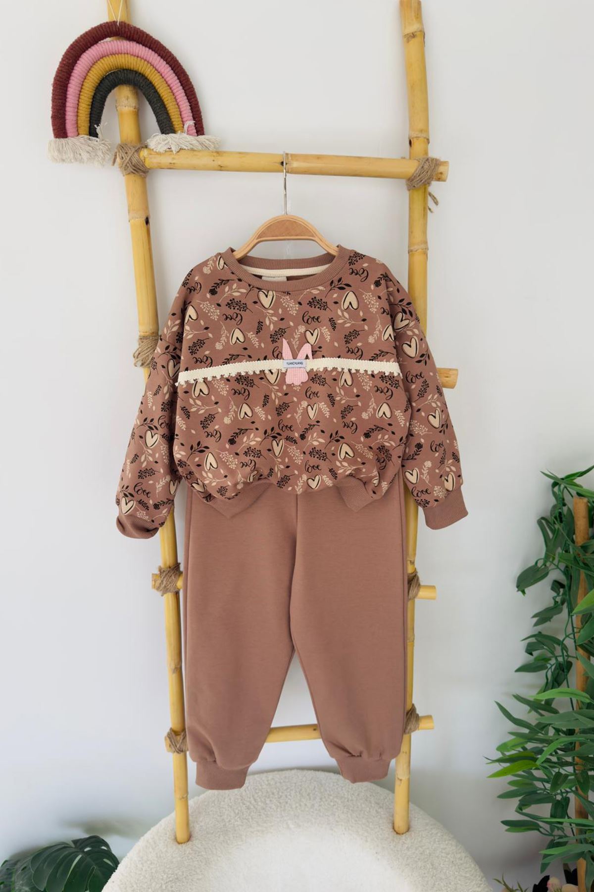 Miniğimin Cicileri Kalp Baskılı Tavşancık Detaylı Kız Çocuk 2 li Takım - Kahverengi