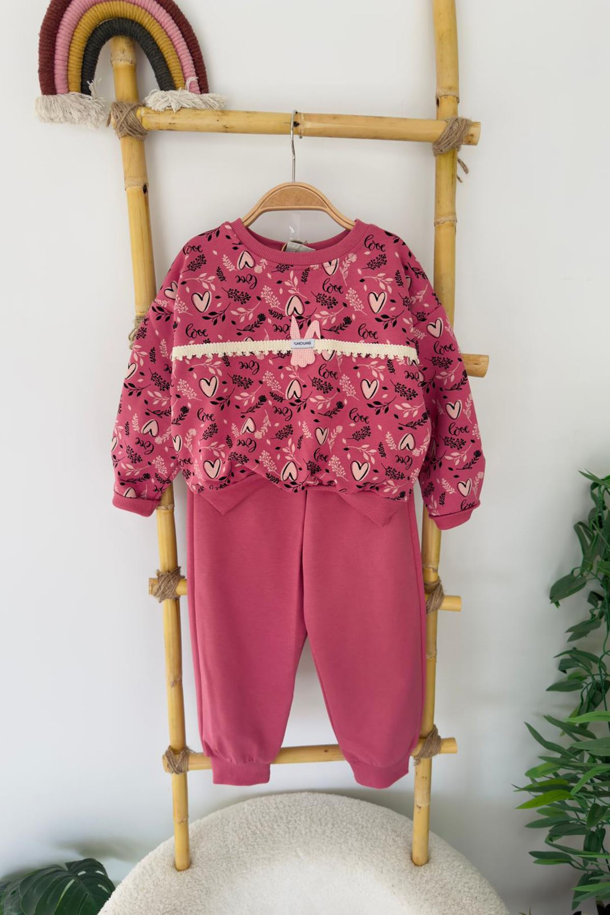 Tatlı kalp desenleri ve tavşancık etiketiyle dikkat çeken bu takım, hem konforlu hem şık bir seçenek sunar.