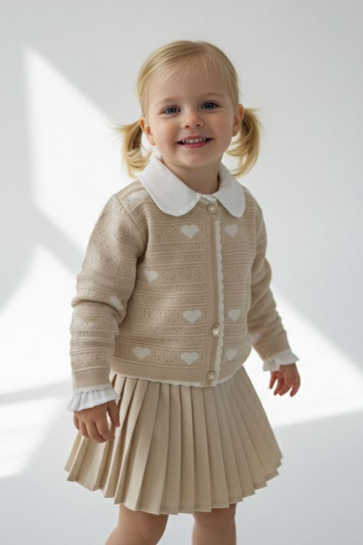 🌸 Miniğimin Cicileri Kalp Desenli Triko Hırkalı Pileli Etekli 3’lü Kız Takımı