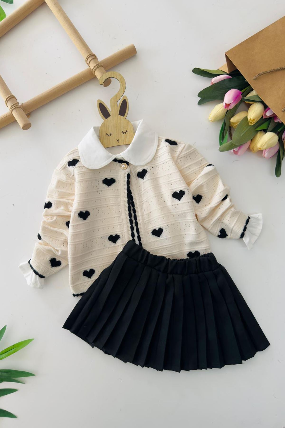 Miniğimin Cicileri Kalp Desenli Triko Hırkalı Pileli Etekli 3 lü Kız Takımı - Siyah