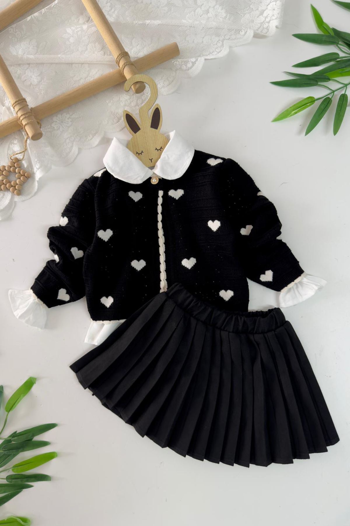 🌸 Miniğimin Cicileri Kalp Desenli Triko Hırkalı Pileli Etekli 3’lü Kız Takımı