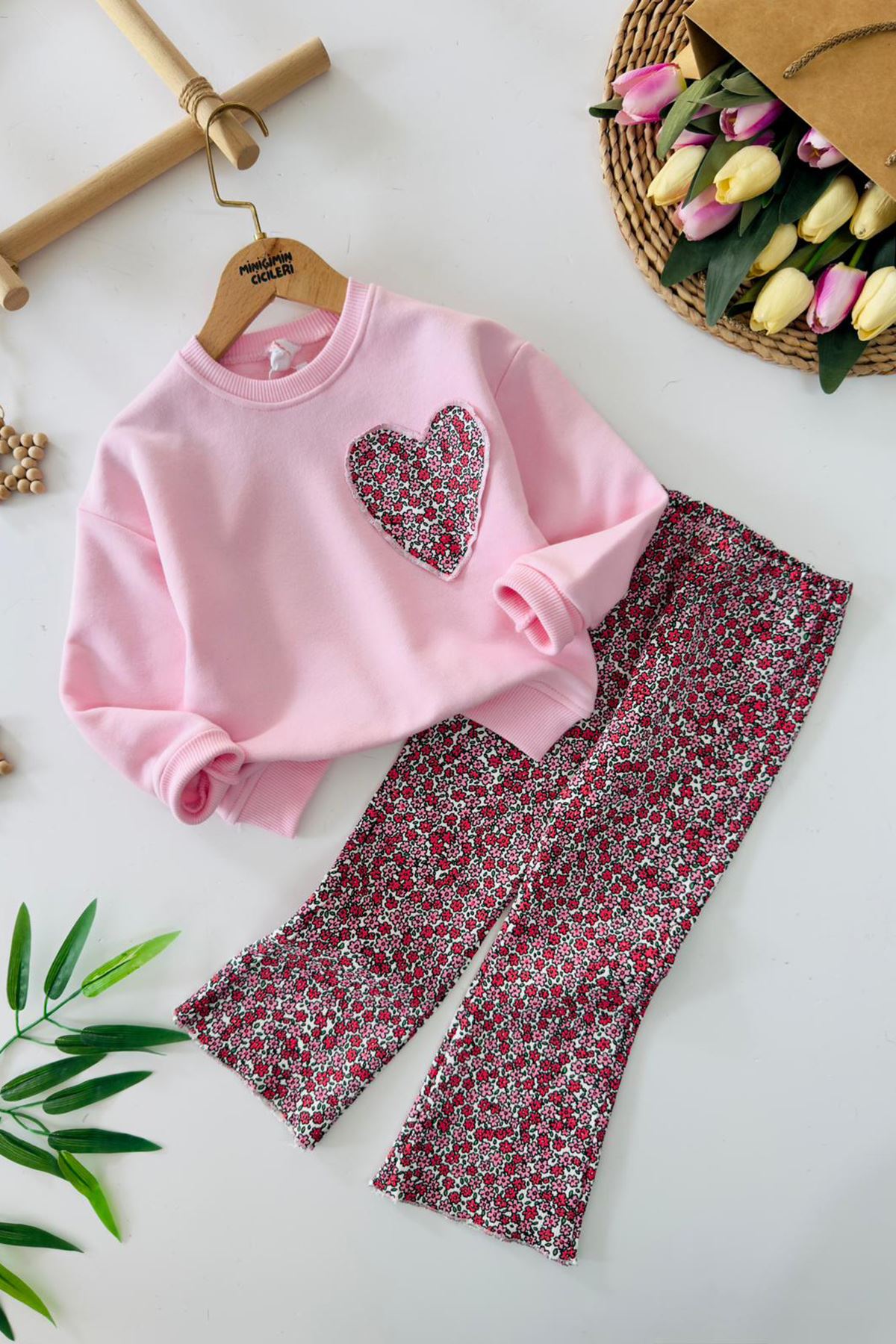 🌸 Miniğimin Cicileri Kalp Detaylı Çiçek Desenli Kız Çocuk 2’li Takım