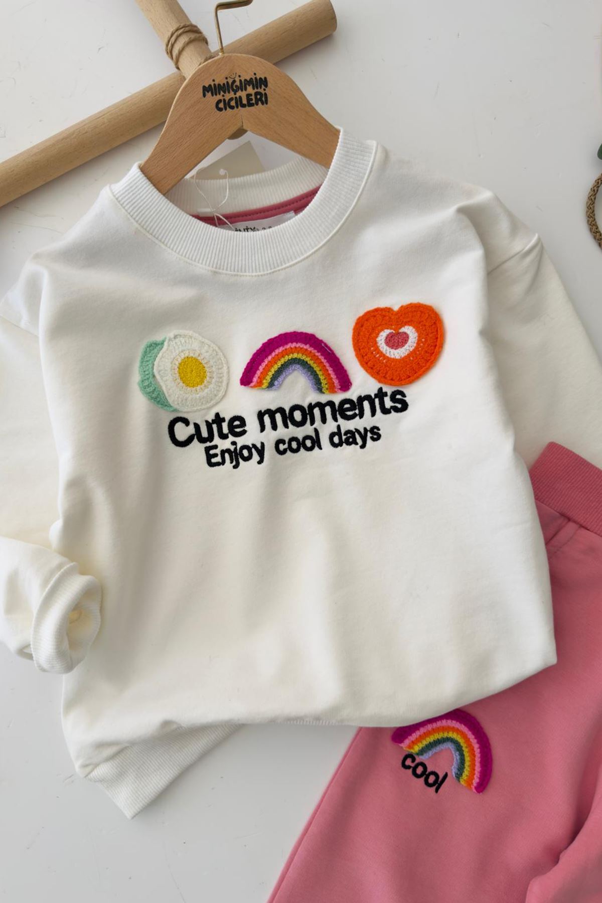 🌸 Miniğimin Cicileri Kalp Gökkuşağı Örhi Detaylı Renkli Kız Çocuk Takım - Krem