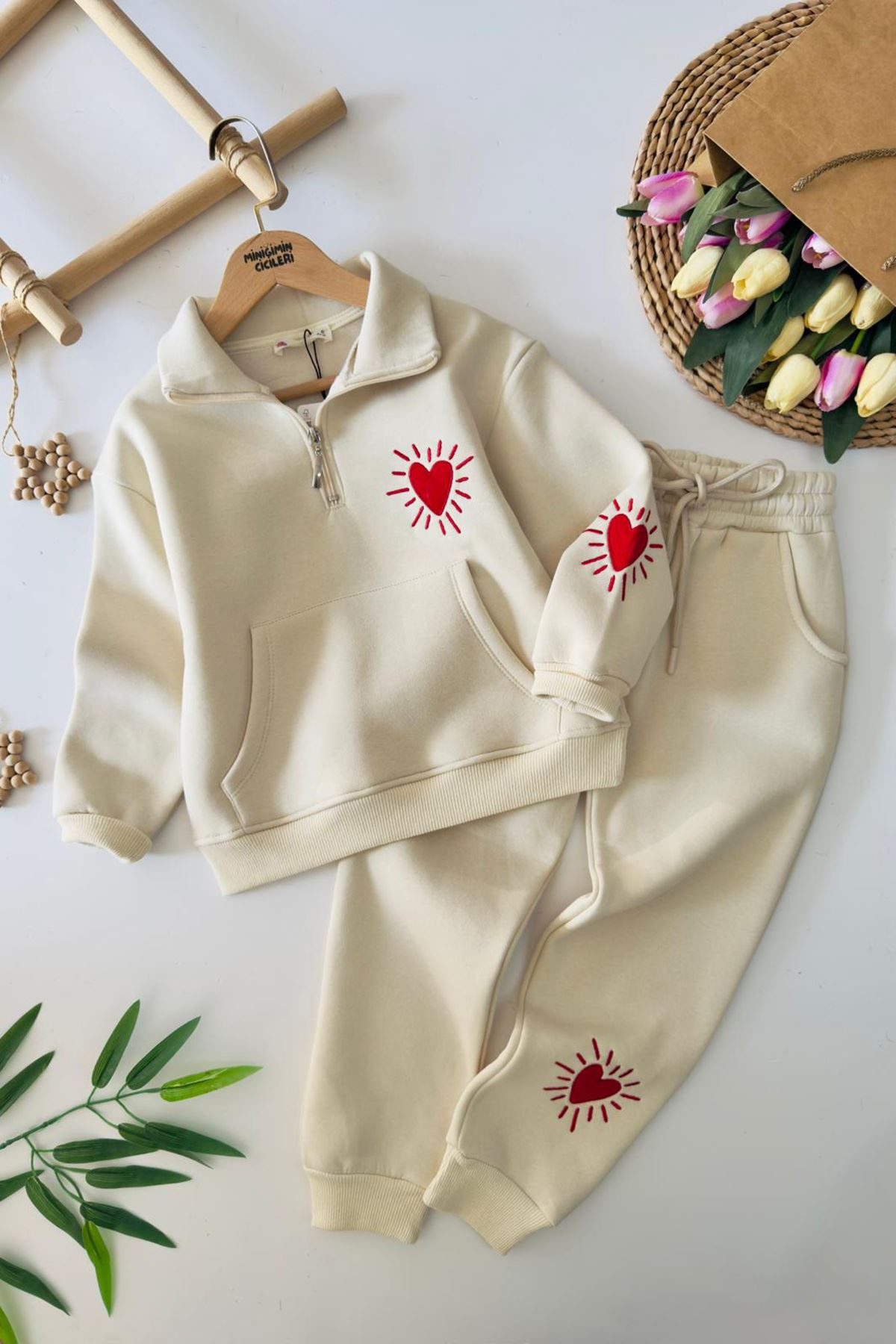 Miniğimin Cicileri Kalp İşleme Detaylı Kışlık Kanguru Cepli Kız Çocuk Takım - Krem