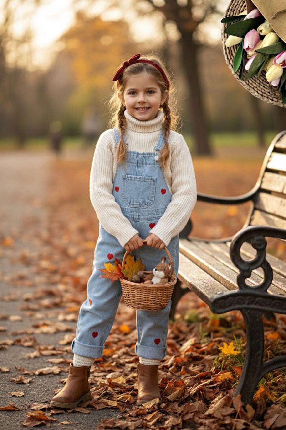 Sevimli kalp detaylarıyla süslenmiş bu şık salopet, minik hanımların günlük kombinlerine tatlı bir enerji katıyor. Hem rahat hem çok tarz!