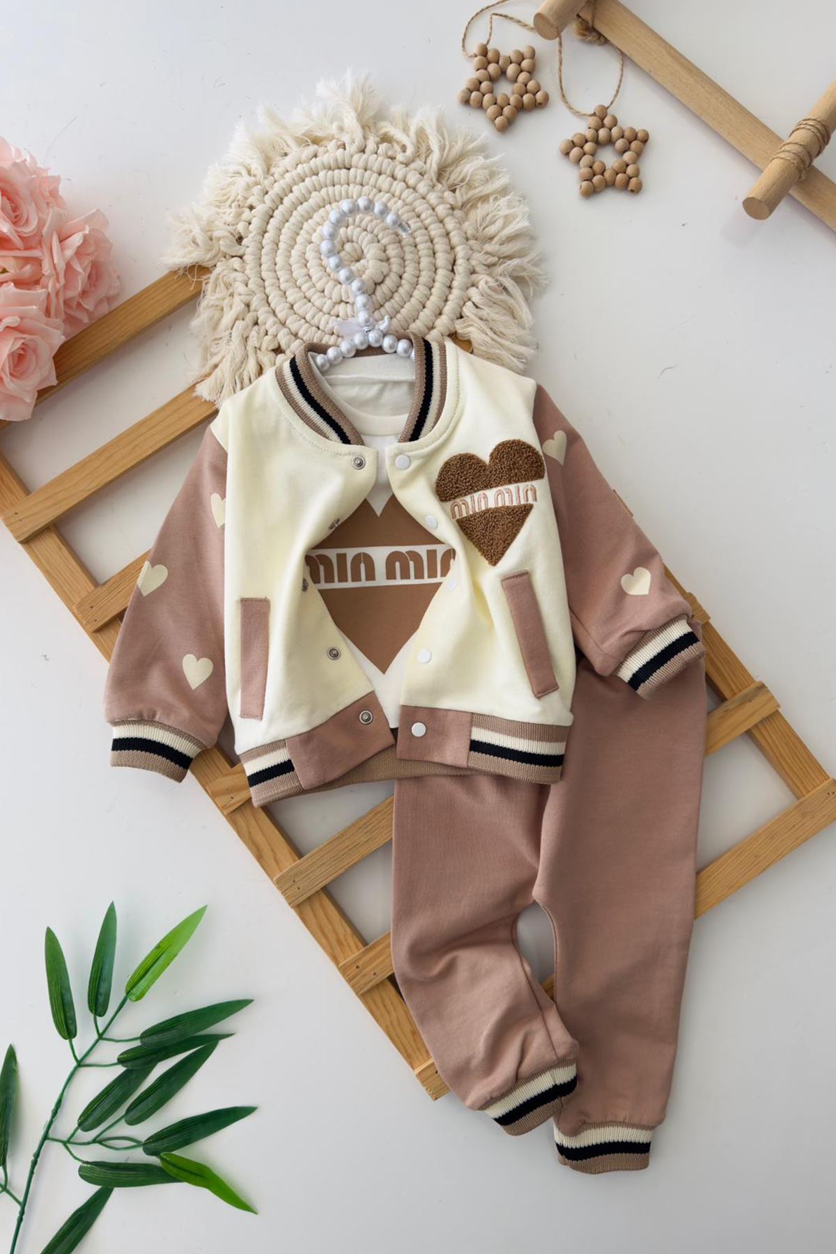 Miniğimin Cicileri Kalp Panç İşleme Detaylı Kız Bebe Kolej Takım - Kahve