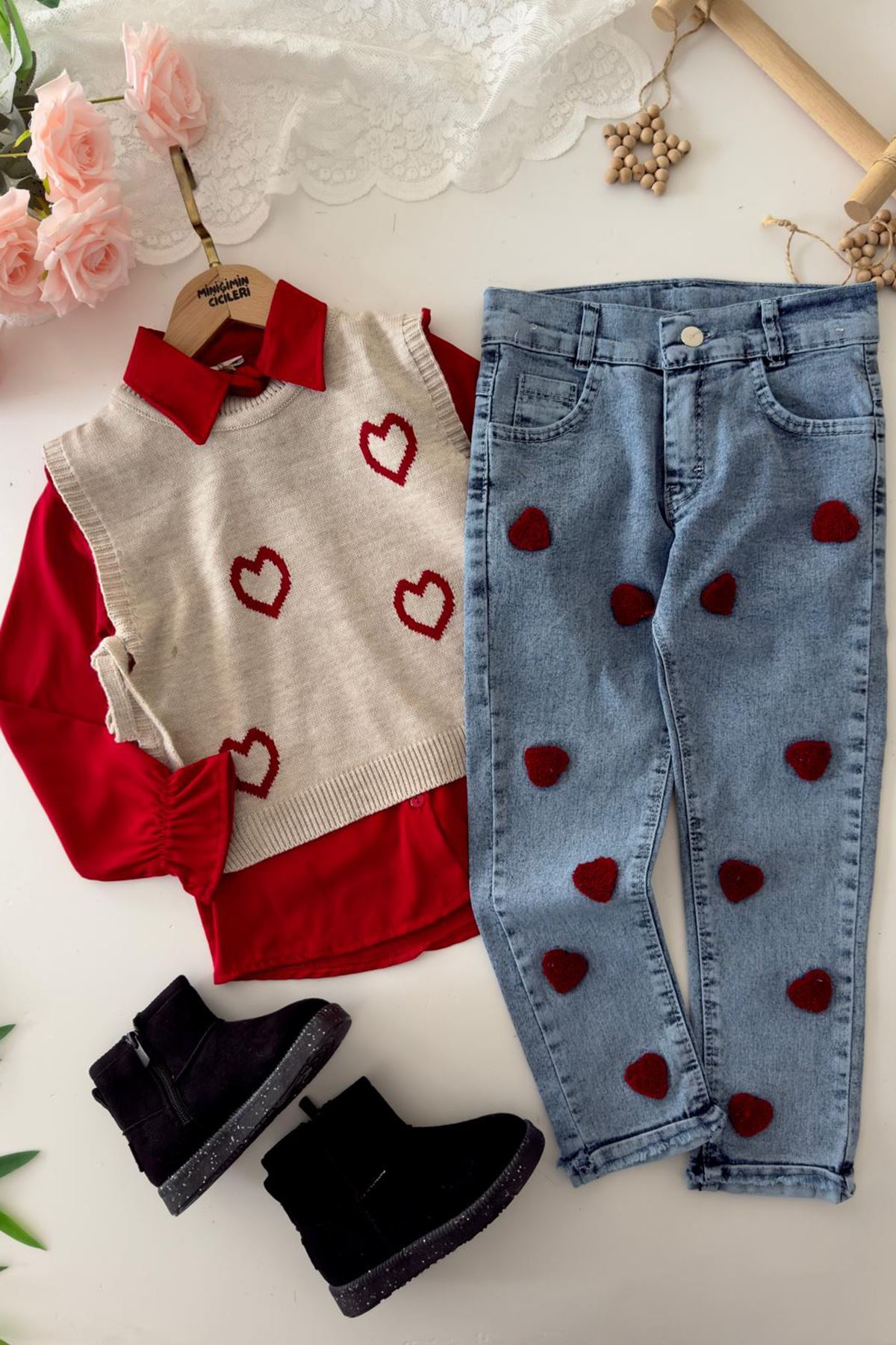 💖 Miniğimin Cicileri Kalp Panç İşleme Detaylı Süveterli 3’lü Takım