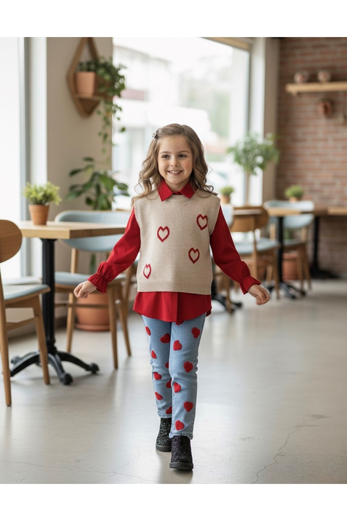 Sezonun en tatlı detaylarını bir araya getiren bu üçlü takım, minik stil ikonları için özenle tasarlandı. Kalpli süveteri, zarif yaka detaylı gömleği ve panç işleme kalpli pantolonu ile hem şık hem sevimli bir görünüm sunuyor.