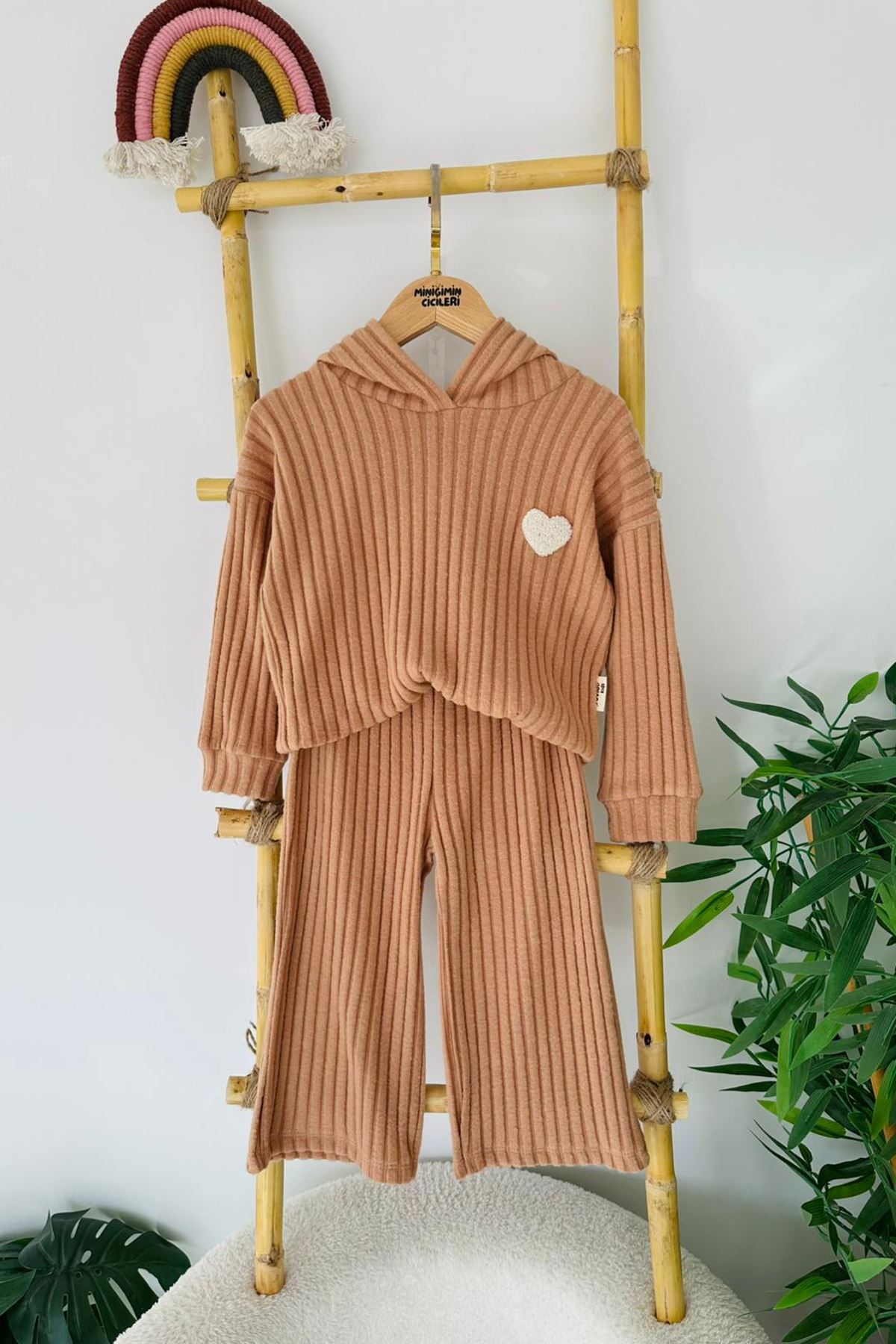 Miniğimin Cicileri Kalp Panç İşlemeli Fitilli Kız Çocuk Mevsimlik Takım - Sütlü Kahve
