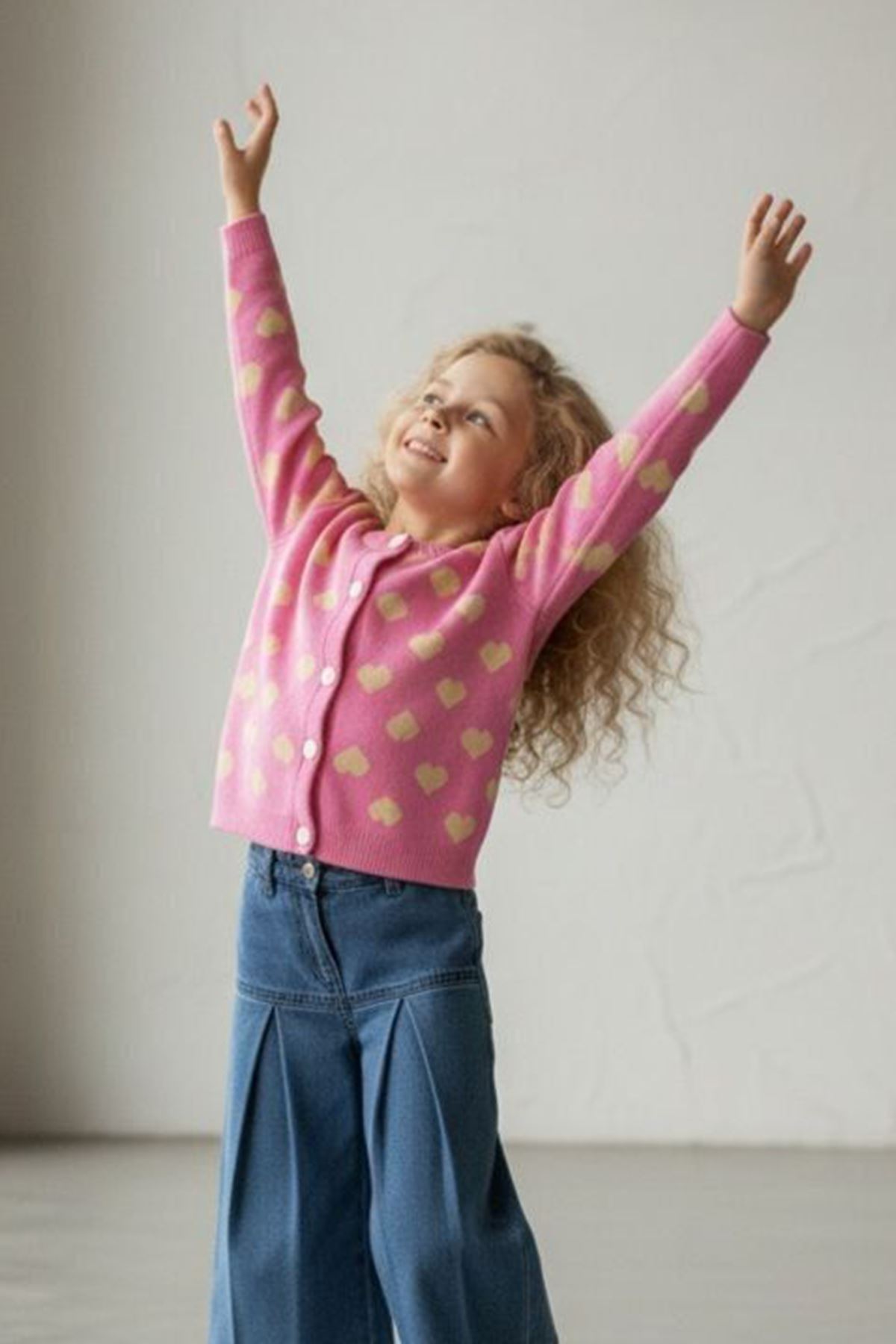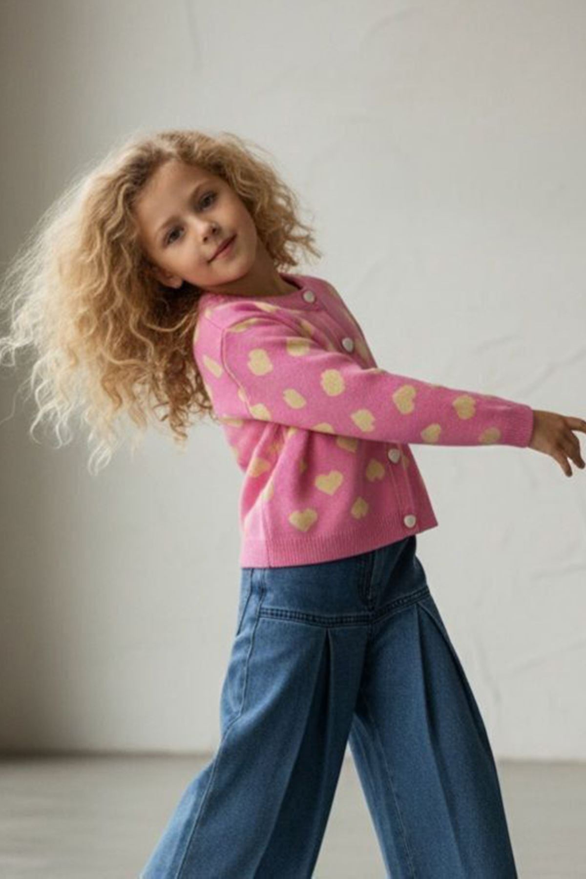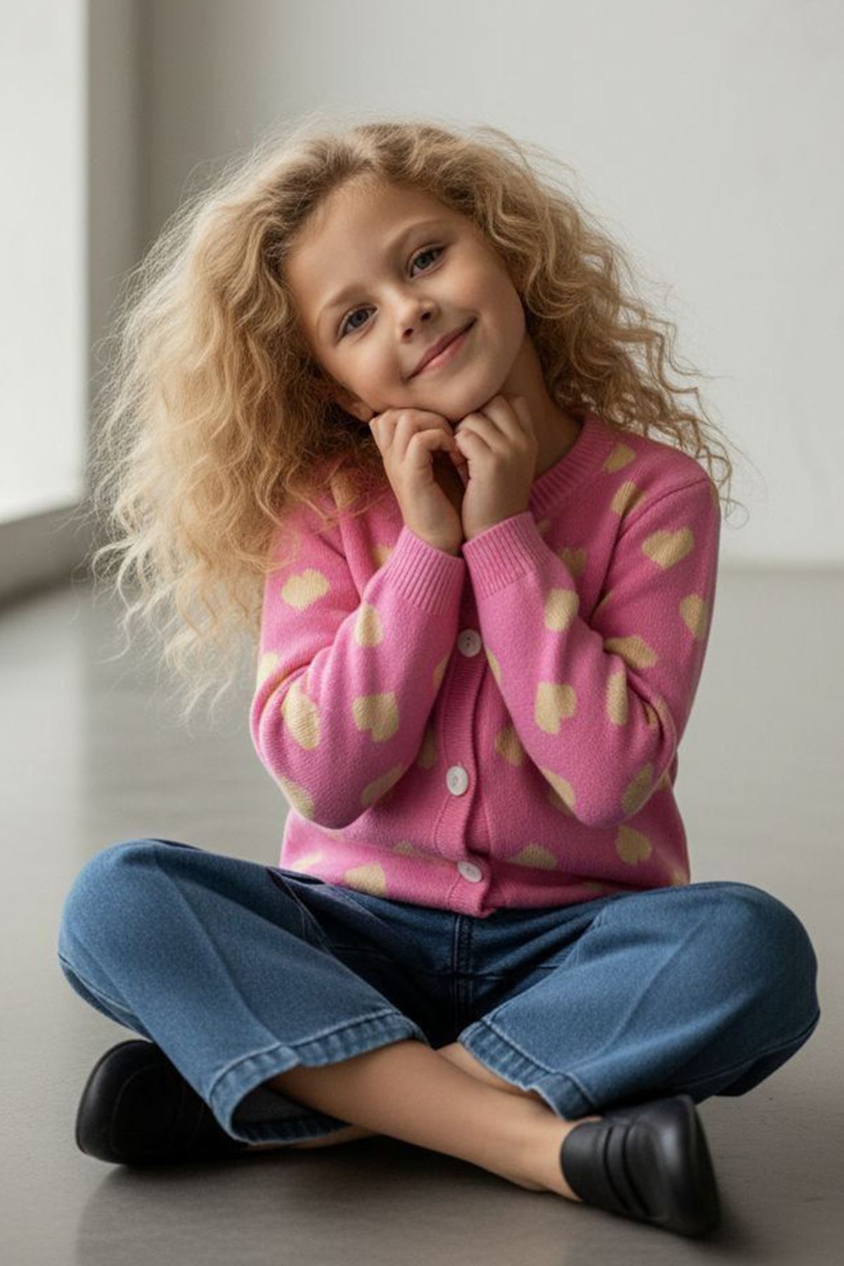 ✨ Ürün Özellikleri: – Kalp desenli triko hırka – Düğme kapamalı ön tasarım – Rahat kalıplı, pile detaylı kot pantolon – Günlük kullanım ve özel gün kombinleri için ideal
