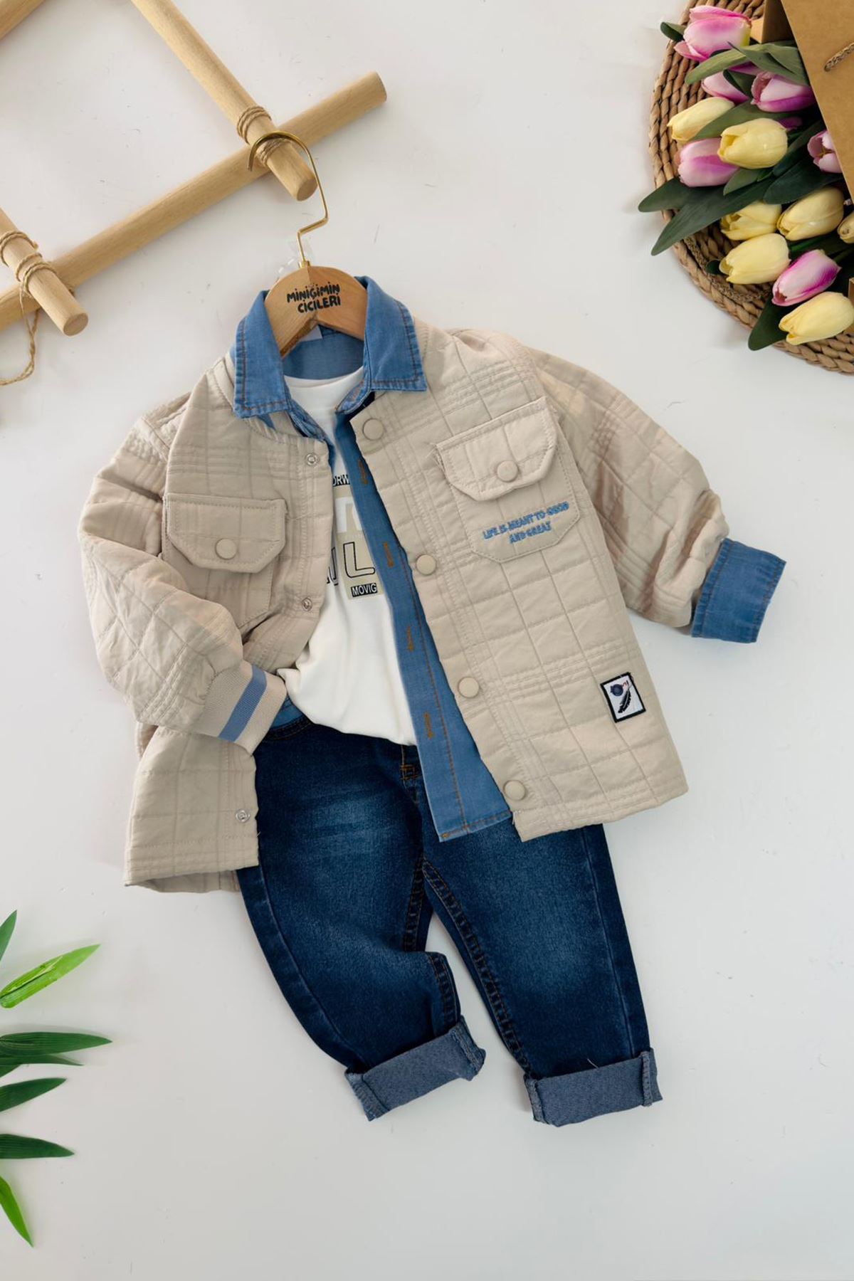 Günlük stilini pratik şekilde tamamlamak isteyen minikler için hazırlanan bu 4’lü set; kapitone ceket, tensel gömlek, tişört ve jean pantolonuyla işlevsel ve uyumlu bir kombin sunar.