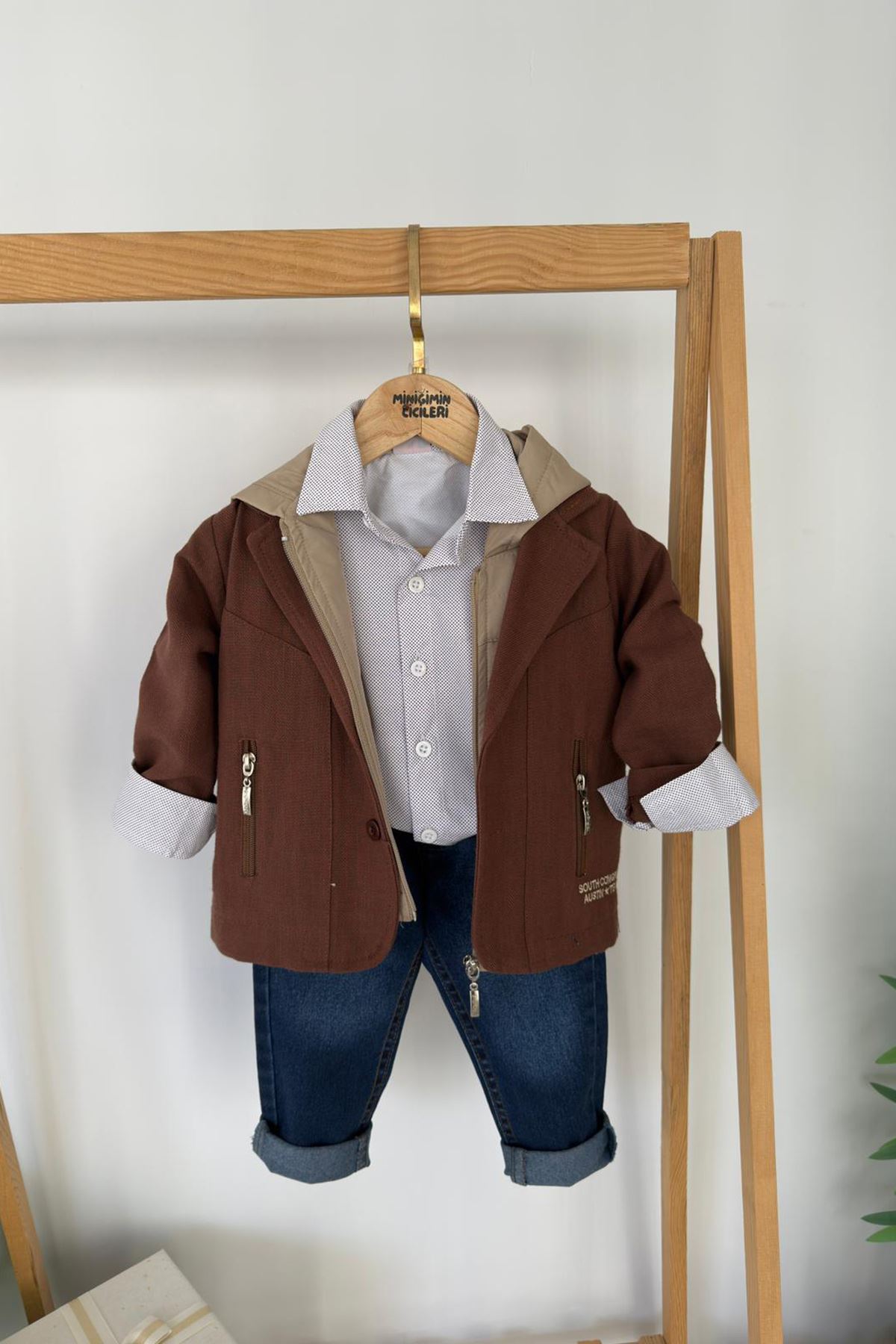Miniğimin Cicileri Kapüşonlu Yelekli Ceketli Gömlek Jean 4’lü Erkek Çocuk Kombin - Kahve