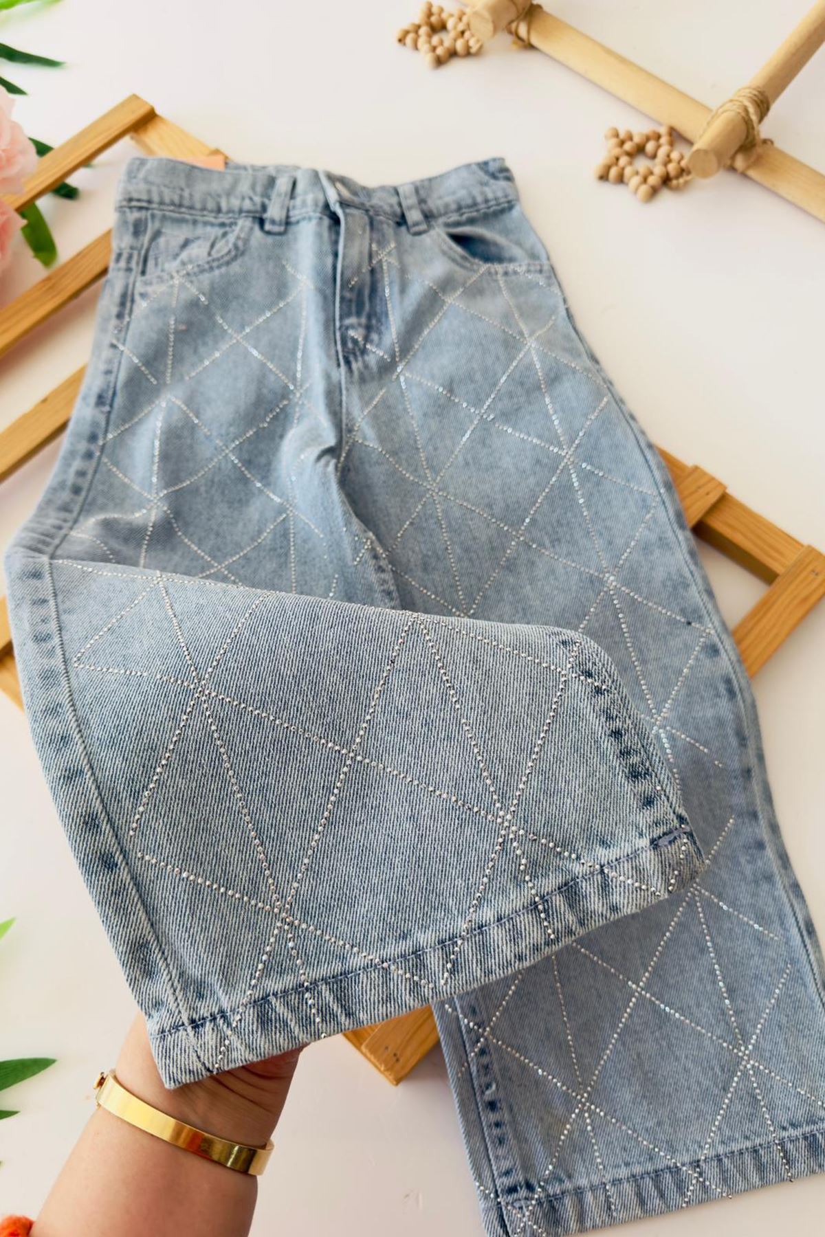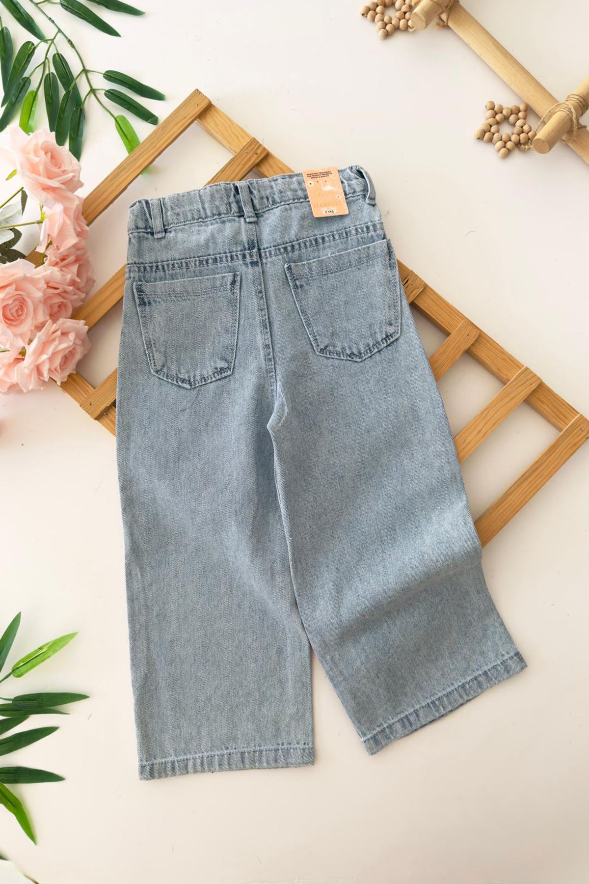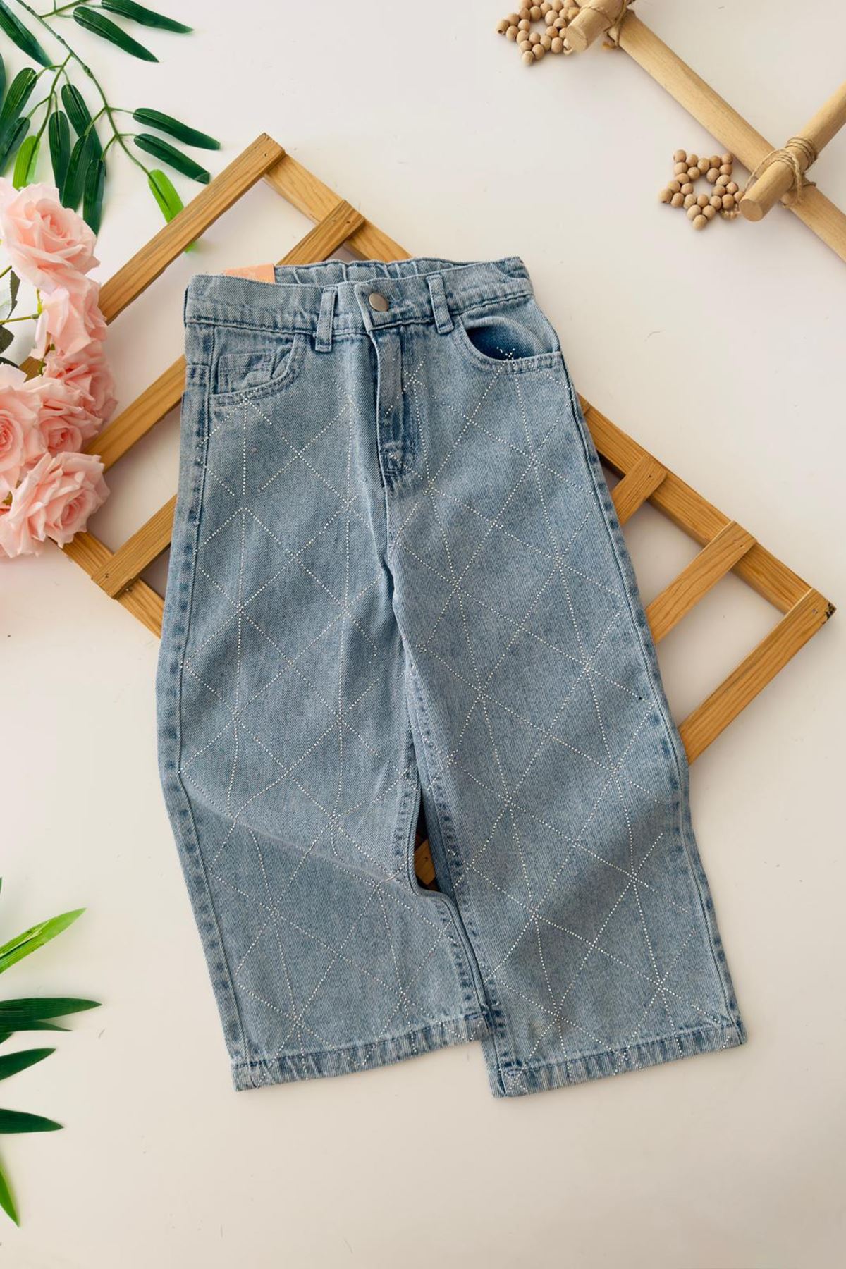 Zarif taş işlemeleriyle dikkat çeken bu kot pantolon, sade şıklığı seven minikler için harika bir seçim!