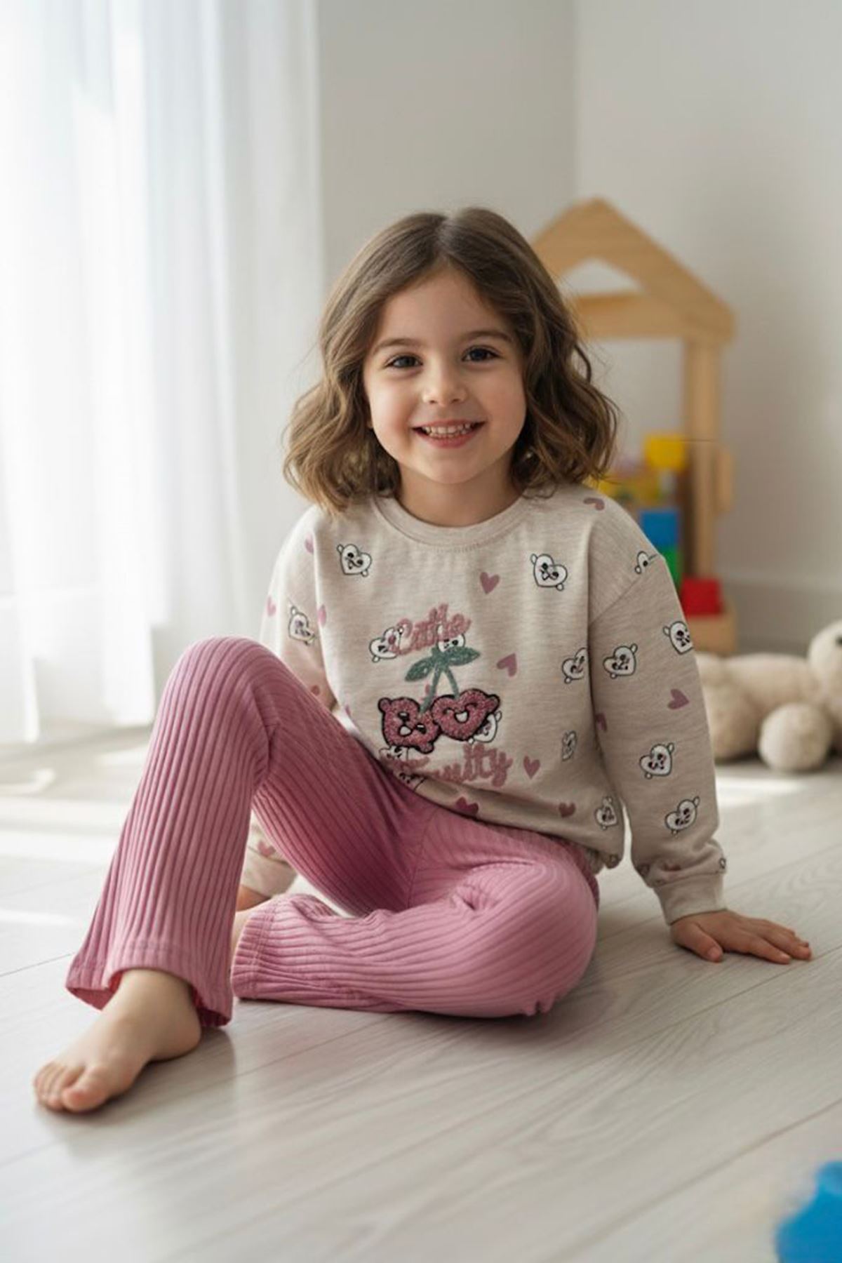 Sevimli kiraz işlemeleri, fitilli tayt dokusu ve pamuksu kumaşıyla bu takım, kız çocuklarının hem şık hem konforlu görünmesini sağlar. Tatlılık ve rahatlık bir arada! 🍒✨