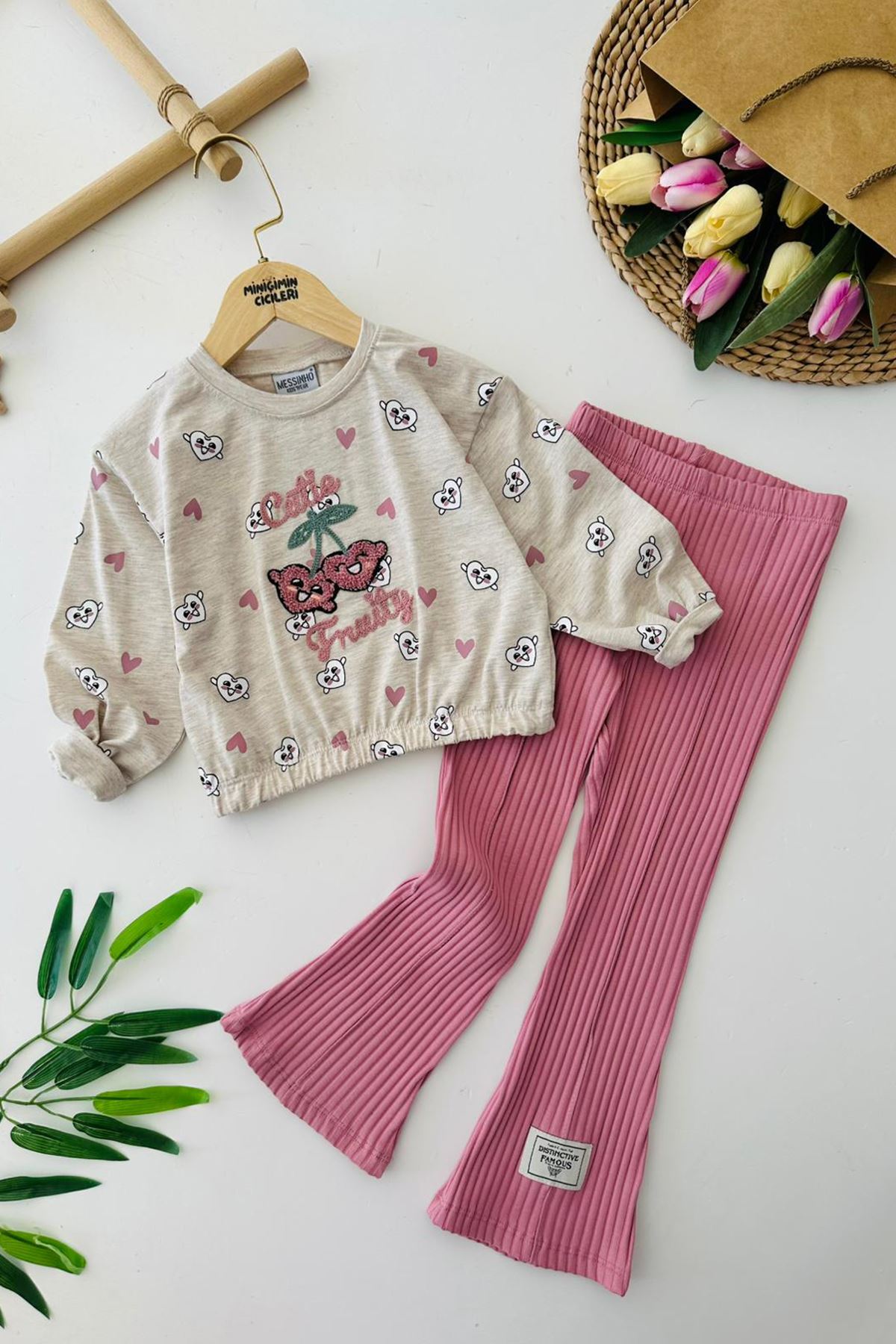 🌸 Kiraz Panç İşleme Detaylı Beli Lastikli Kız Çocuk Takım – Penye Kumaş