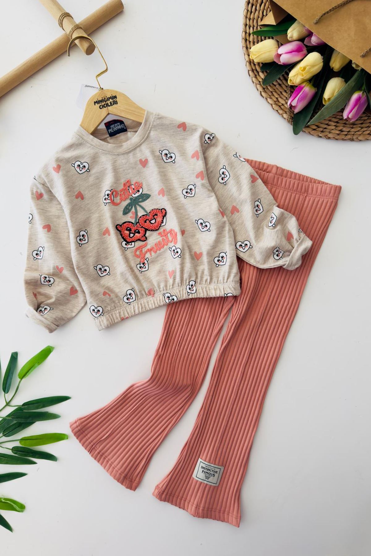 🌸 Kiraz Panç İşleme Detaylı Beli Lastikli Kız Çocuk Takım – Penye Kumaş