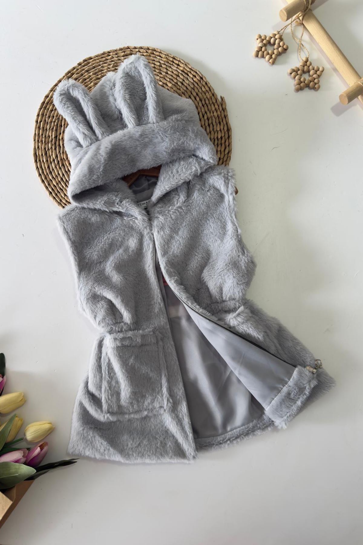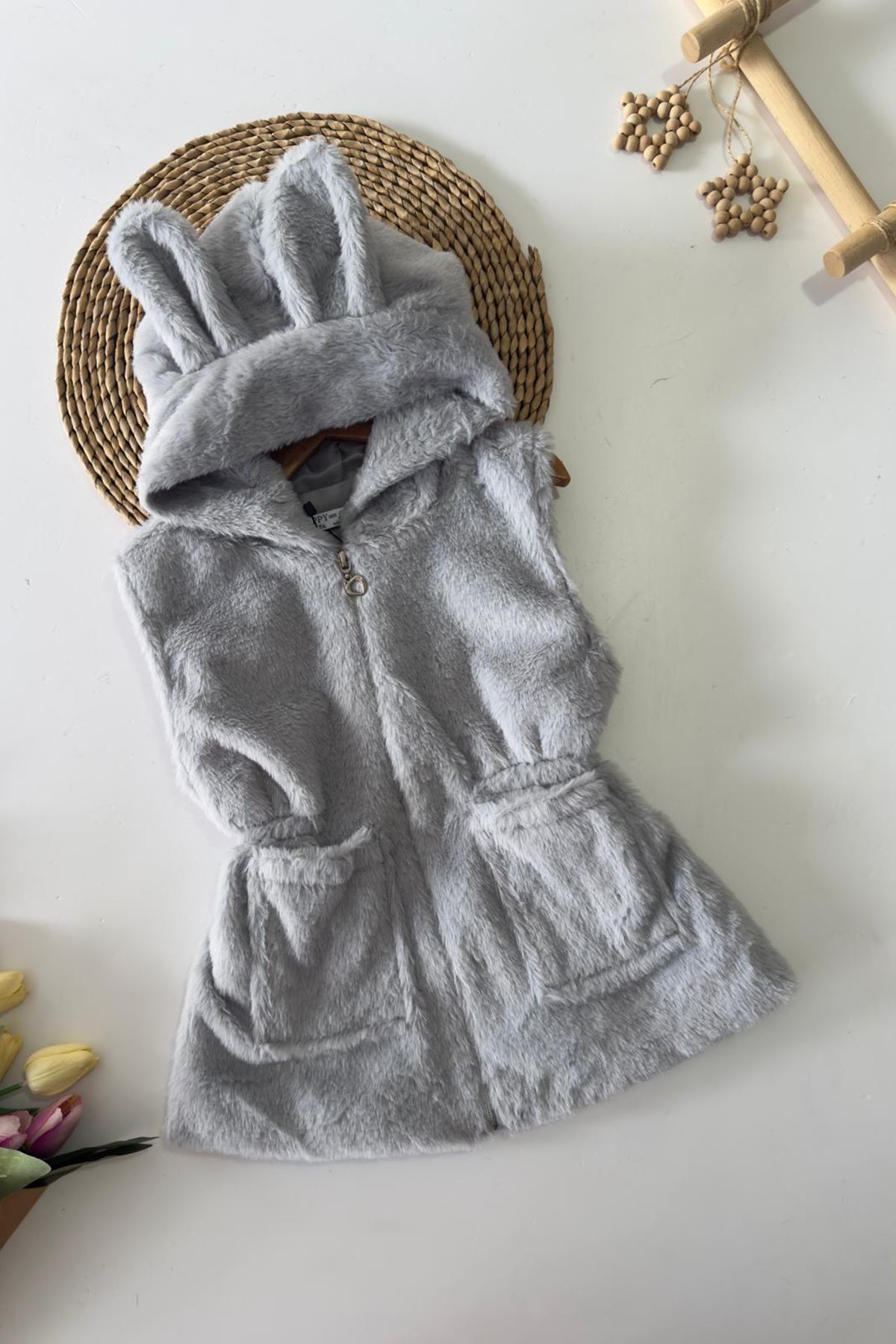 Miniğimin Cicileri Kulak Detaylı Peluş Cepli Çocuk Yelek - Gri