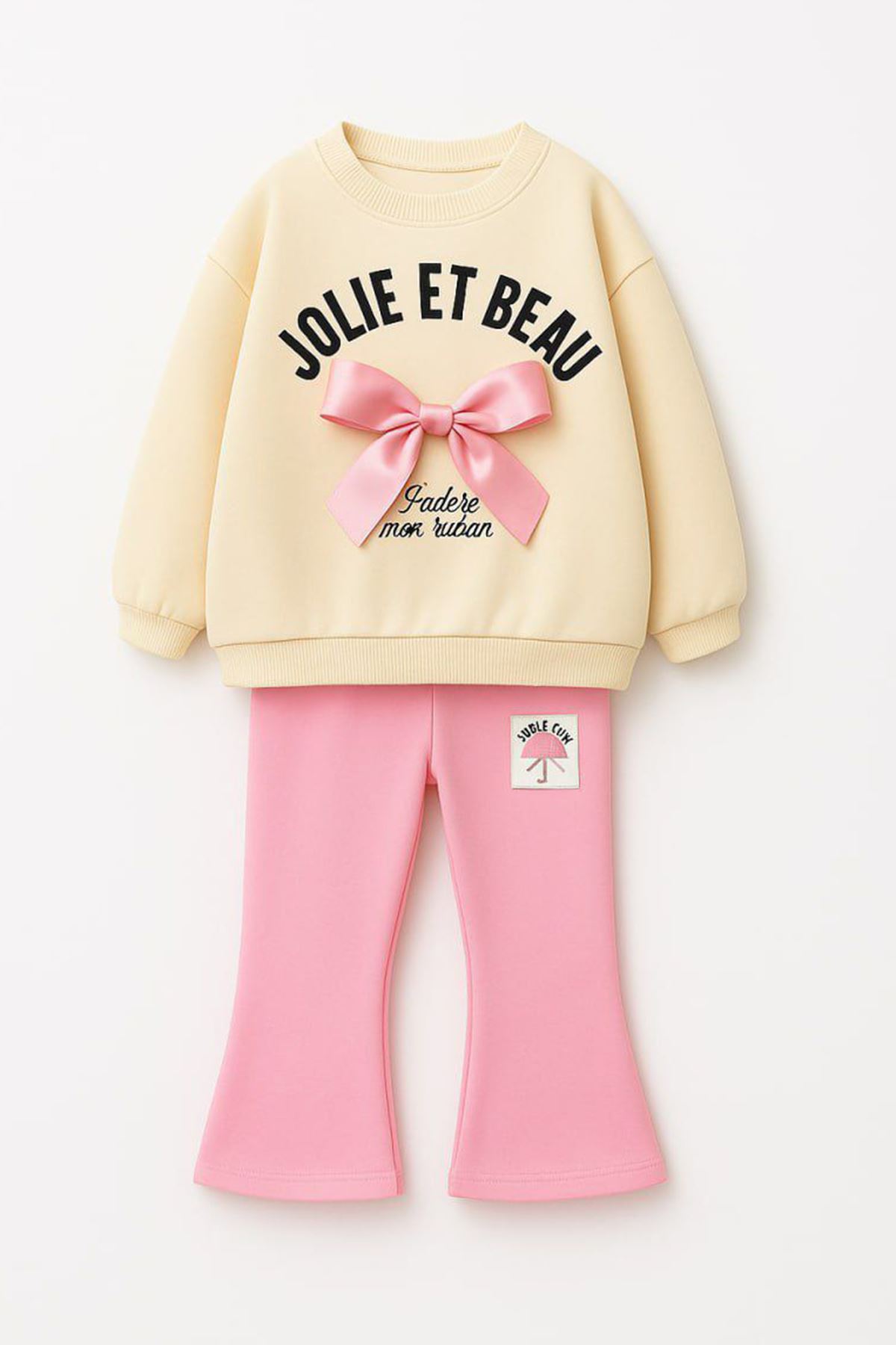 Şıklığı ve rahatlığı bir arada sunan kurdele detaylı kız çocuk takımı, minik prenseslerin günlük kombinlerinde sevimli bir dokunuş yaratıyor. 🎀✨