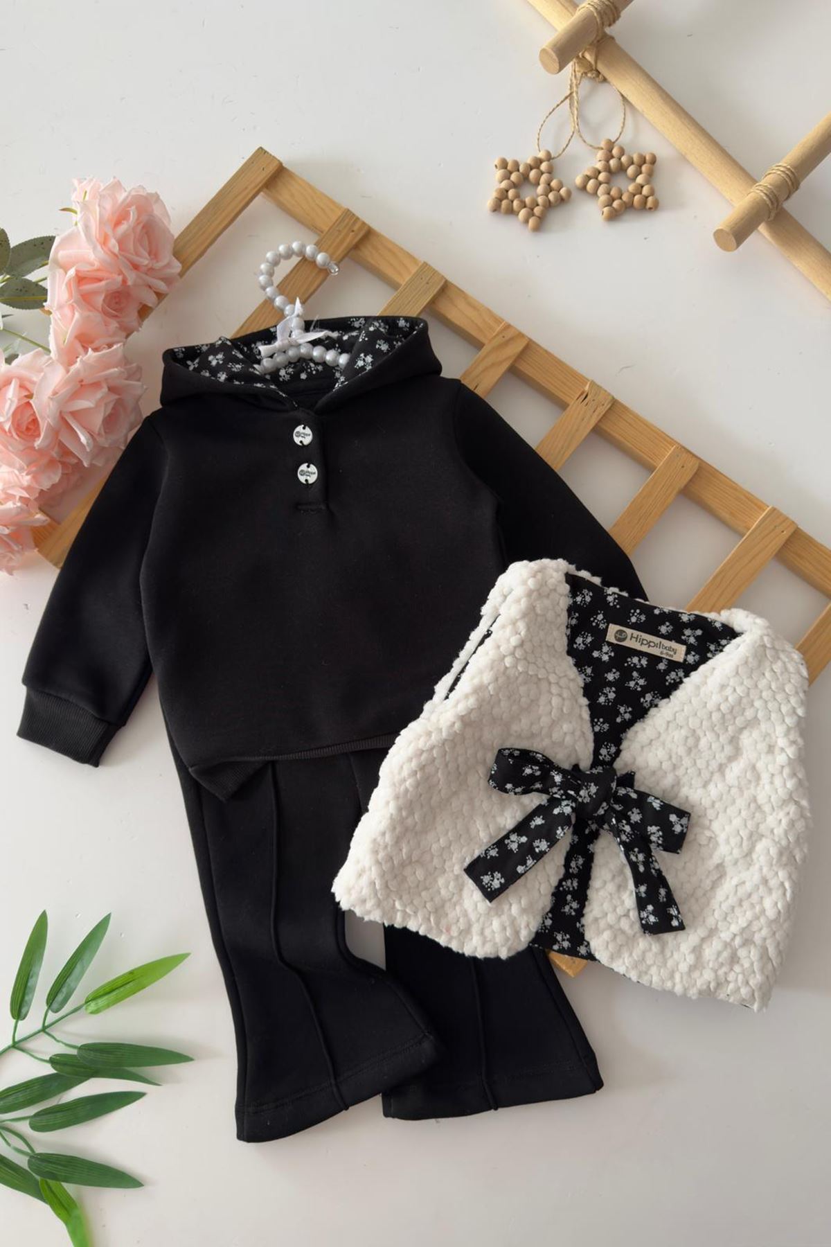 ✨ Ürün Özellikleri: 🧵 3 ip şardonlu kumaş, kalın dokusuyla soğuk havalarda ekstra sıcak tutar. 👕 Kapüşonlu üst, çiçek desenli astarı ve düğme detaylarıyla modern bir görünüm sunar. 👖 Alt parça, esnek yapısıyla rahat hareket imkanı sağlar ve gün boyu konfor sunar. 🧸 Kürk bolero, yumuşacık dokusuyla şıklığı tamamlar, çiçek desenli iç astarı ve bağlama kurdelesiyle zarif bir hava katar. 🎀 3 parça birlikte kullanılabileceği gibi ayrı ayrı da kombinlenebilir.