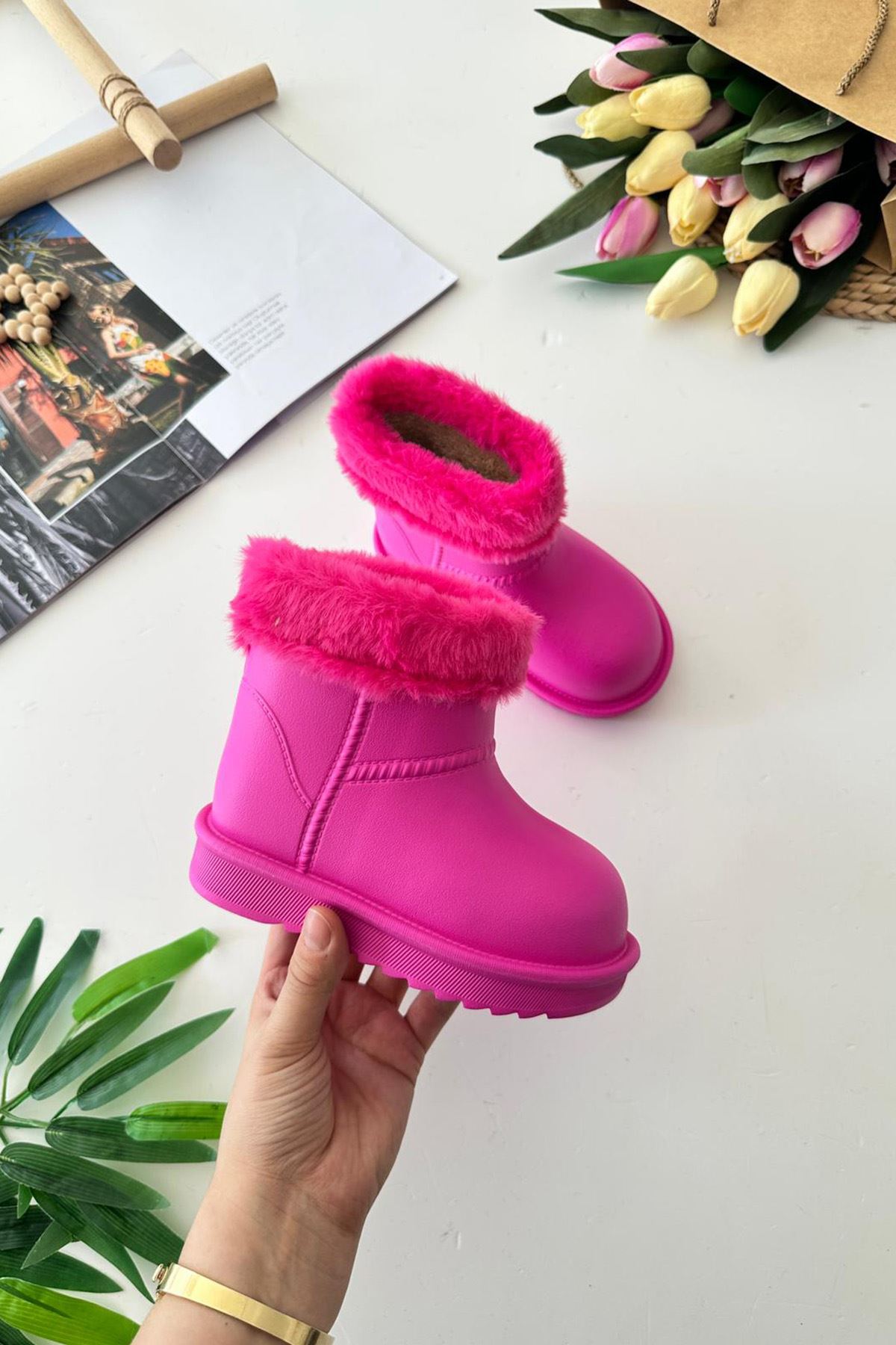Yumuşacık kürk detayıyla sıcacık tutan bu renkli yağmur botu, su geçirmez yapısıyla miniklerin dışarıda özgürce oynamasına olanak tanır. Her adımda konfor ve sevimlilik bir arada! 🌧️👢