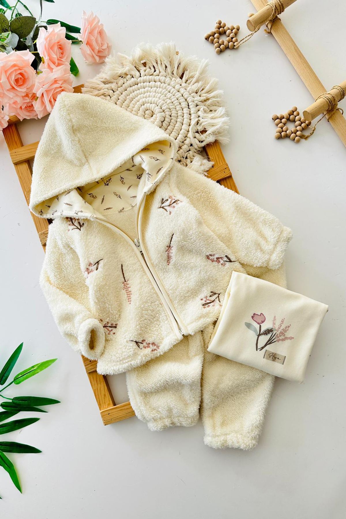 Bebeklerin hassas ciltlerine özel yumuşacık peluş dokusuyla tasarlanmış bu 3’lü takım, hem şıklığı hem de konforu bir arada sunar. Lale temalı zarif desenlerle süslenen takım, soğuk günlerde miniklerin sıcacık kalmasını sağlar.