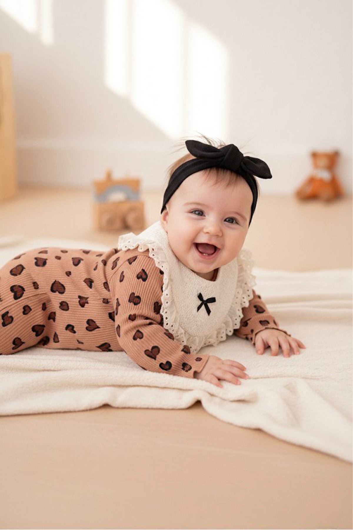 Minik kalpler ve leopar dokunuşu bir arada! 💖 Bu tulum, zarif deseni ve yumuşacık kumaşıyla bebeğinizin gün boyu rahat etmesini sağlarken sevimli tarzını da tamamlıyor. 🌸