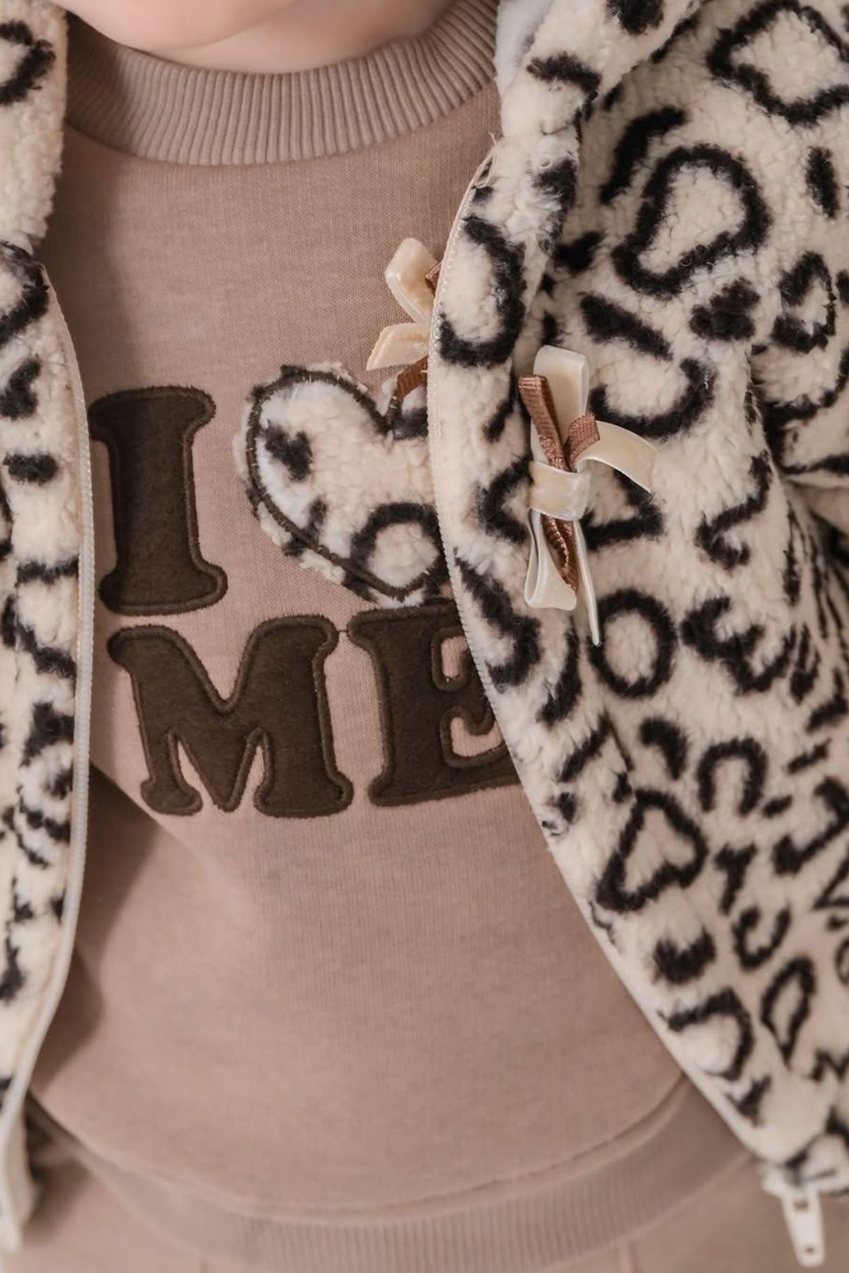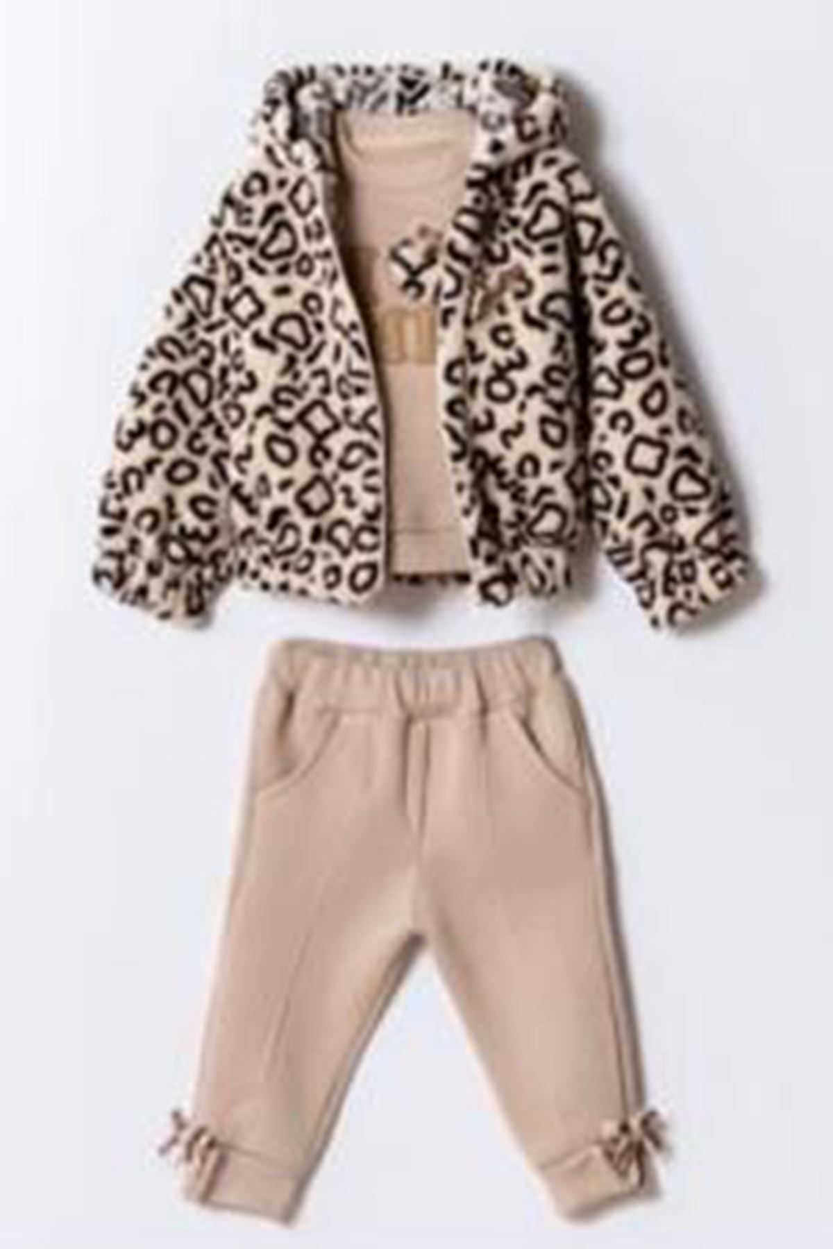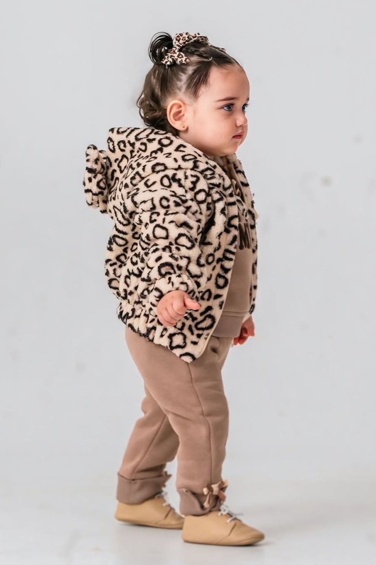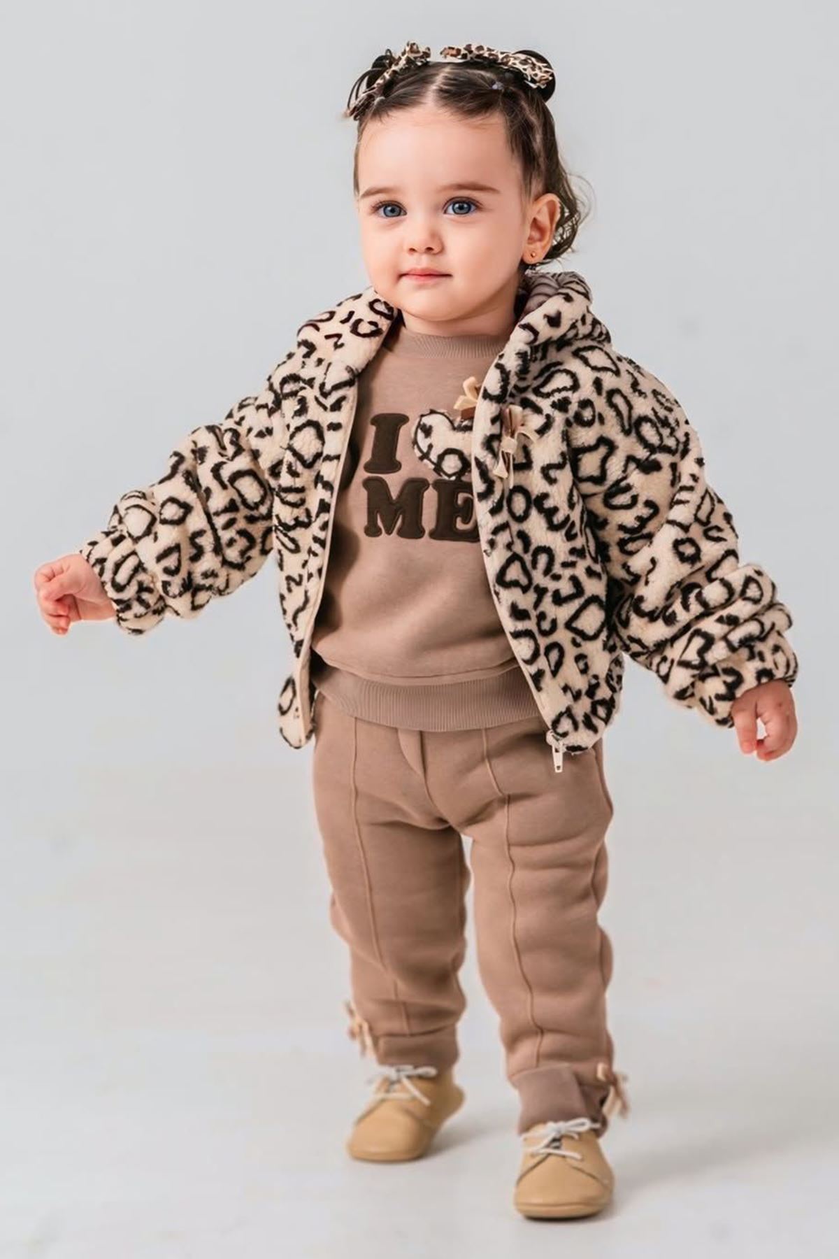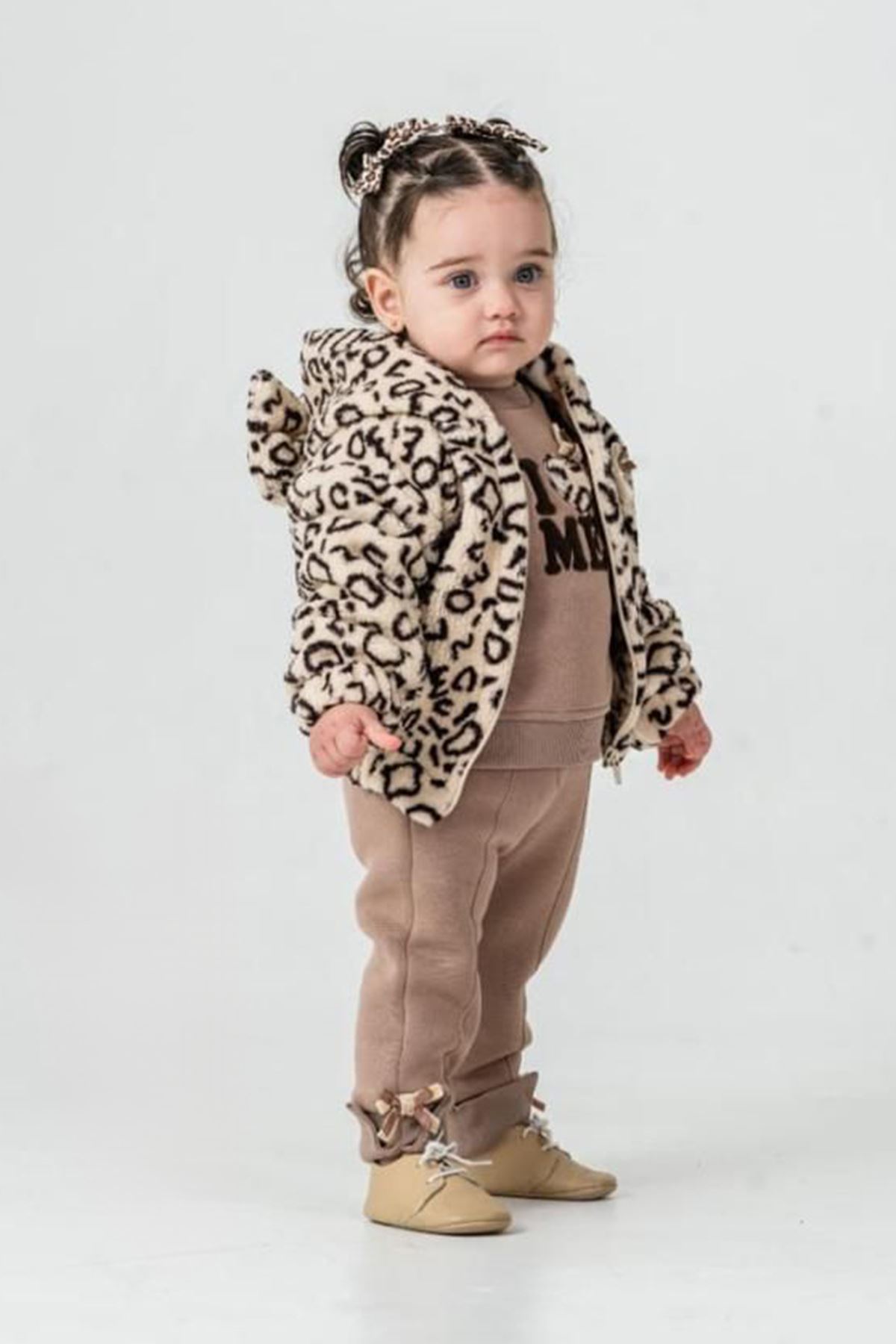 Hem şık hem sıcacık! Leopar desenli polar ceket, baskılı üst ve fiyonk detaylı alt parçadan oluşan bu takım, miniklerin kış gardırobunun gözdesi olacak. ❄️🐆👶