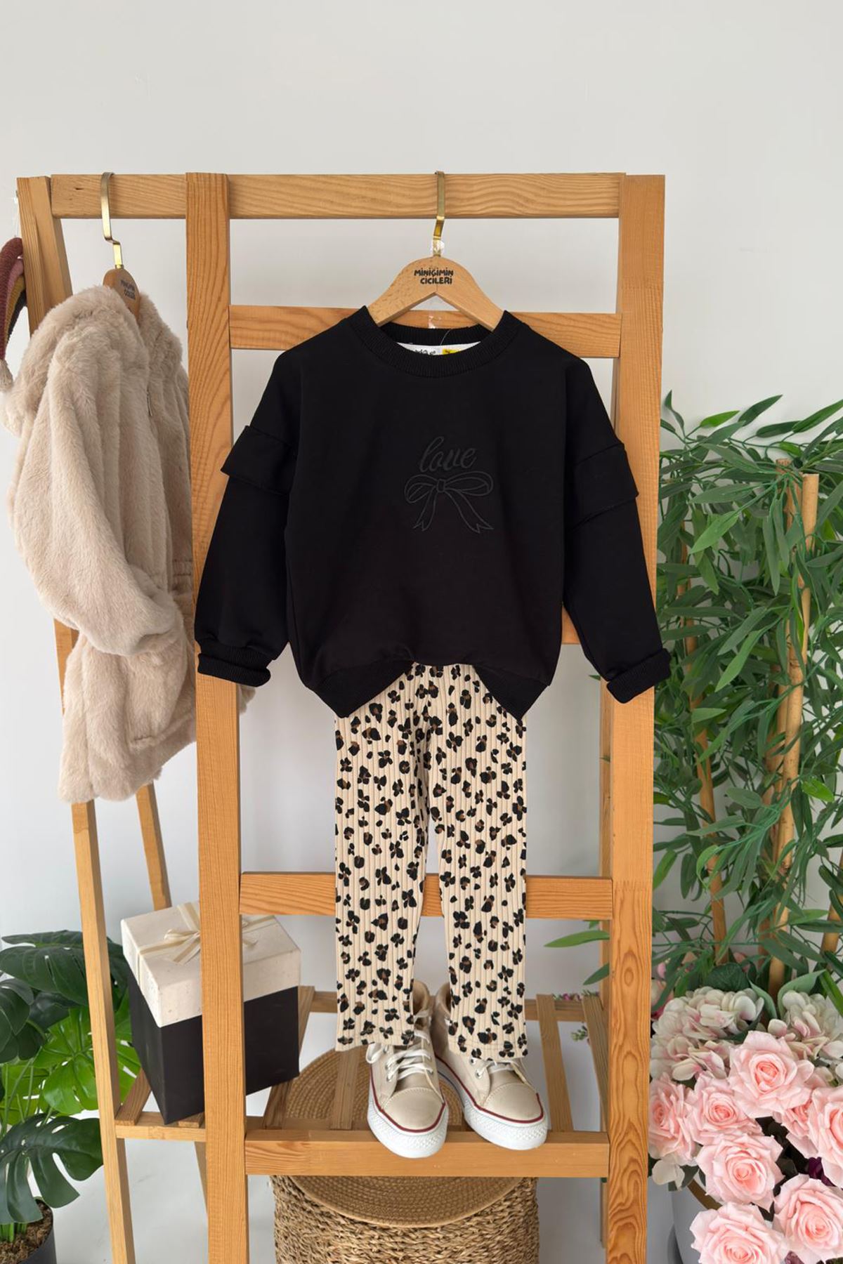 ✨ Ürün Özellikleri: ✔️ Üst kısmında “Love” nakış detayı ve minimal fiyonk motifi. ✔️ Esnek yapısıyla rahat hareket imkanı sunan leopar desenli tayt. ✔️ Günlük kullanım, okul ve arkadaş buluşmaları için ideal kombin. ✔️ Modern ve sevimli tasarımıyla tek başına da farklı parçalarla da uyumlu.
