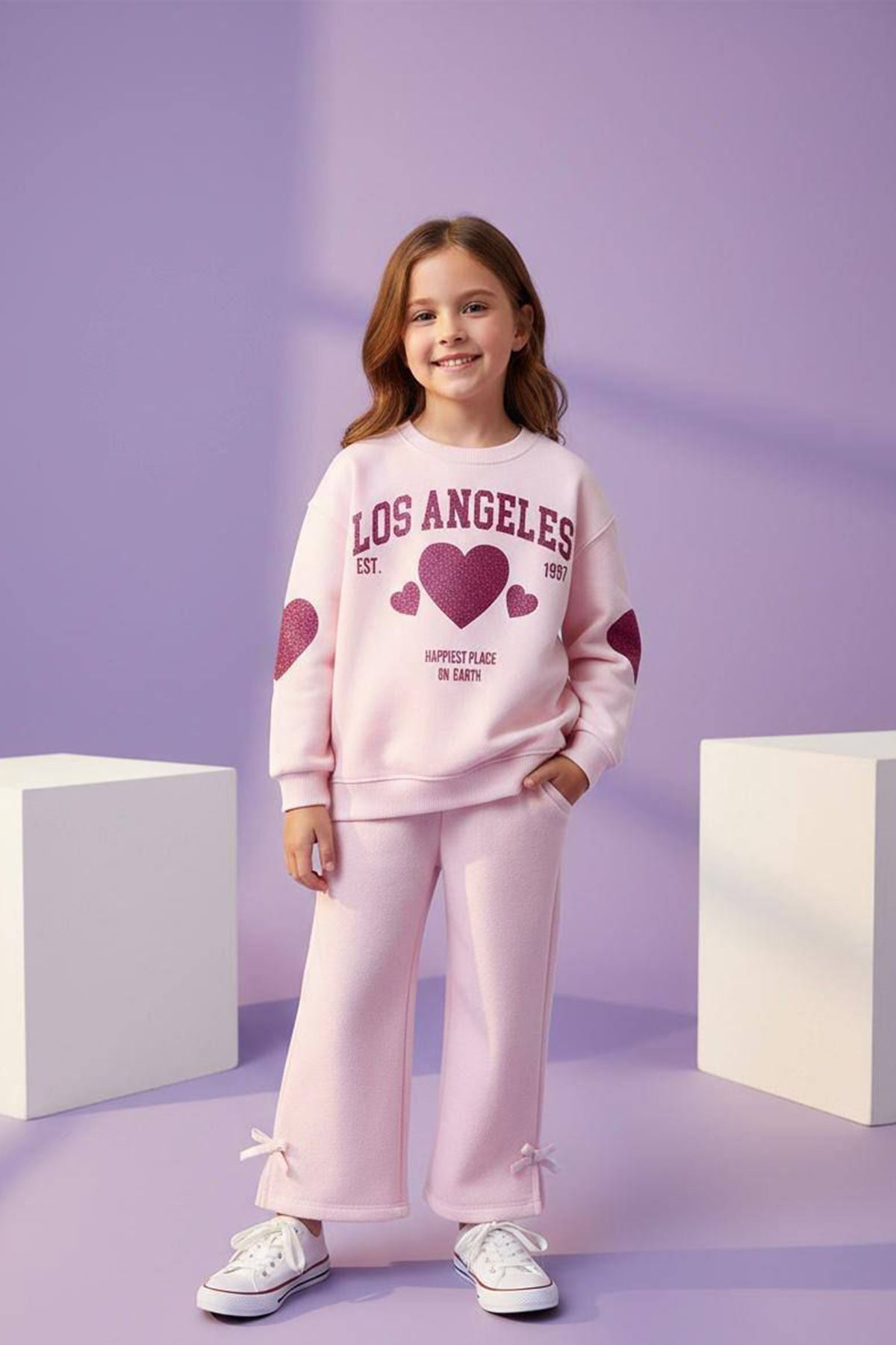 ✨ Ürün Özellikleri: ✔️ Los Angeles yazılı ve kalp baskılı sweatshirt tasarımı. ✔️ Paça kısımlarında fiyonk detayları ile zarif görünüm. ✔️ 3 ip şardonsuz, %100 pamuk kumaş ile terletmeyen konfor. ✔️ Baskılarda sim sıvama detayı ile parlak ve dikkat çekici bir stil. ✔️ Günlük kullanım ve özel günlerde rahat kombin imkanı.