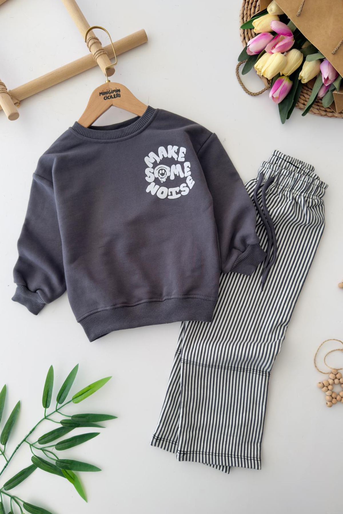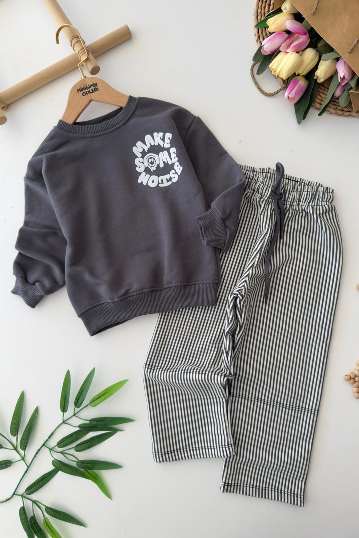 ✨ Ürün Özellikleri: ✔️ Göğüs kısmında “Make Some Noise” baskı detaylı sweatshirt ✔️ Çizgili desenli pantolon ile spor ve modern görünüm ✔️ 3 ip şardonsuz, %100 pamuk kumaş sayesinde yumuşak ve sağlıklı kullanım ✔️ Günlük aktiviteler için rahat kalıp ✔️ Hem evde hem dışarıda kullanım için ideal