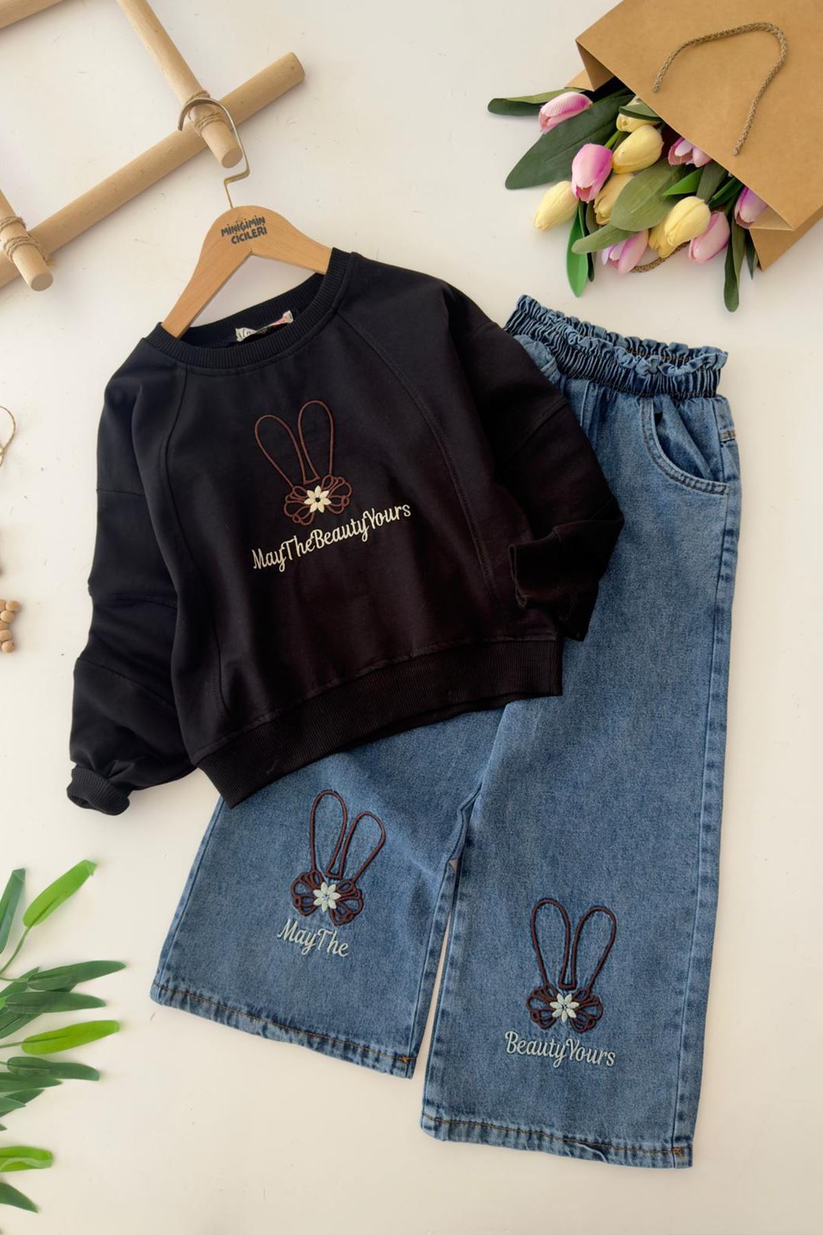 ✨ Ürün Özellikleri: 👕 Üst: Yumuşak dokulu sweatshirt, ön kısmında “May The Beauty Yours” yazısı ve sevimli tavşan kulaklı nakış detayı yer alır. 👖 Alt: Bol paça rahat kesim denim pantolon, her iki bacağında işleme detayları ve tavşan figürleriyle tamamlanmıştır. 🧵 Günlük kullanıma uygun, hareket özgürlüğü sağlayan konforlu kumaş yapısı. 👧 Bel lastiği sayesinde kolay giyilip çıkarılabilir.