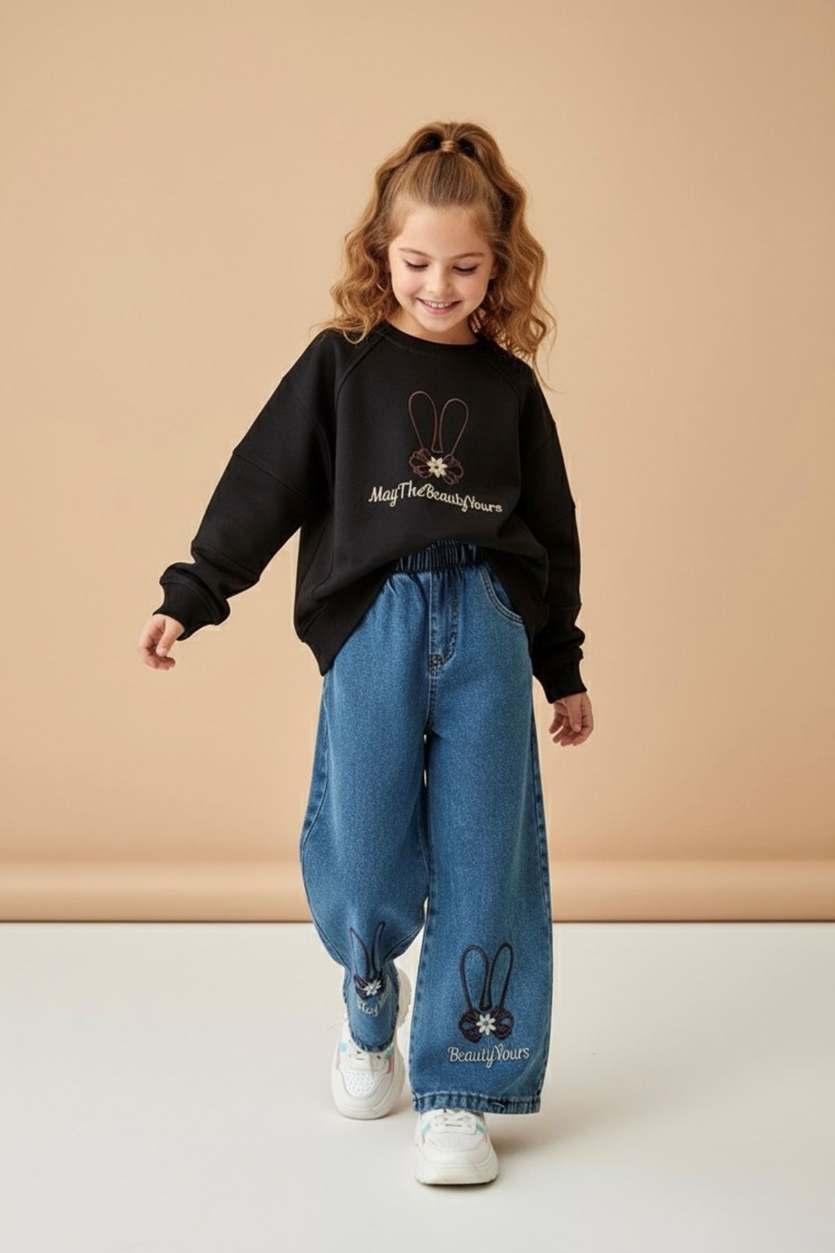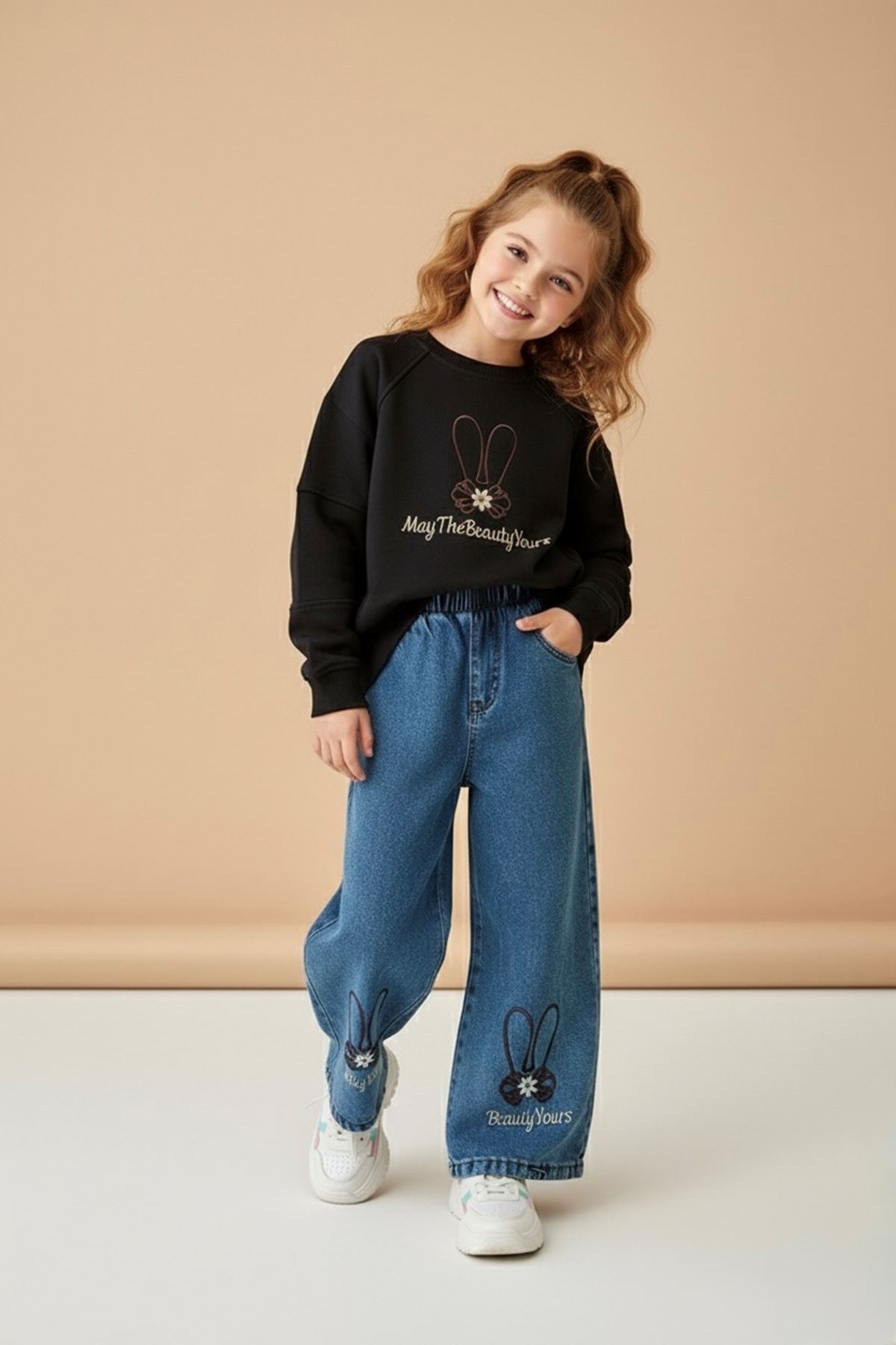 ✨ Ürün Özellikleri: 👕 Üst: Yumuşak dokulu sweatshirt, ön kısmında “May The Beauty Yours” yazısı ve sevimli tavşan kulaklı nakış detayı yer alır. 👖 Alt: Bol paça rahat kesim denim pantolon, her iki bacağında işleme detayları ve tavşan figürleriyle tamamlanmıştır. 🧵 Günlük kullanıma uygun, hareket özgürlüğü sağlayan konforlu kumaş yapısı. 👧 Bel lastiği sayesinde kolay giyilip çıkarılabilir.