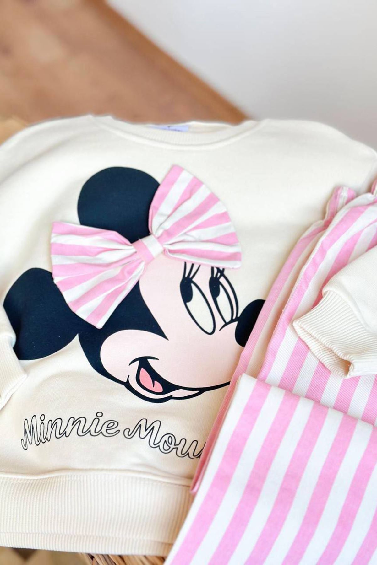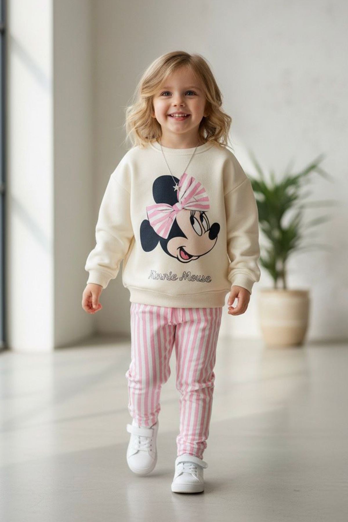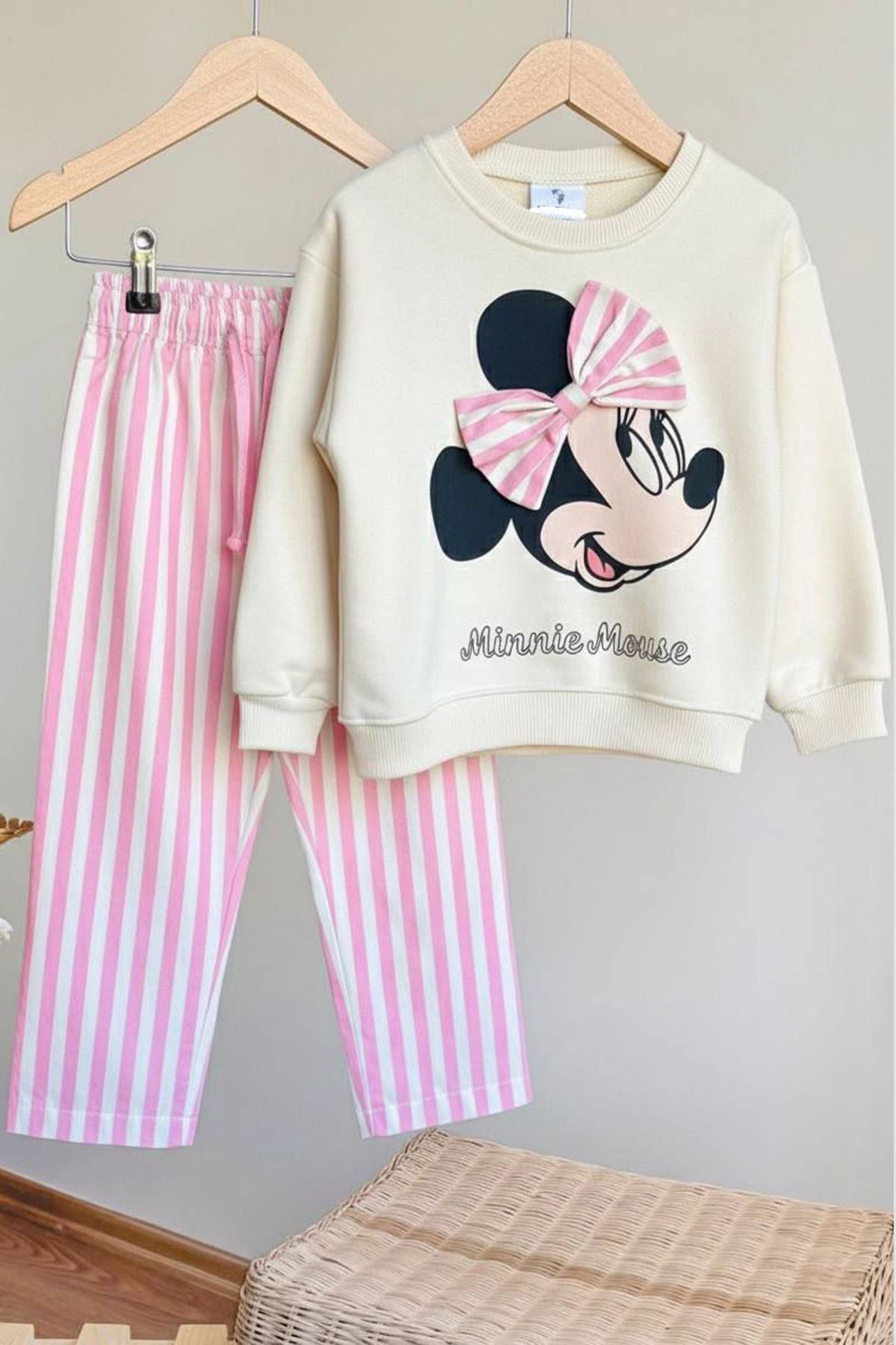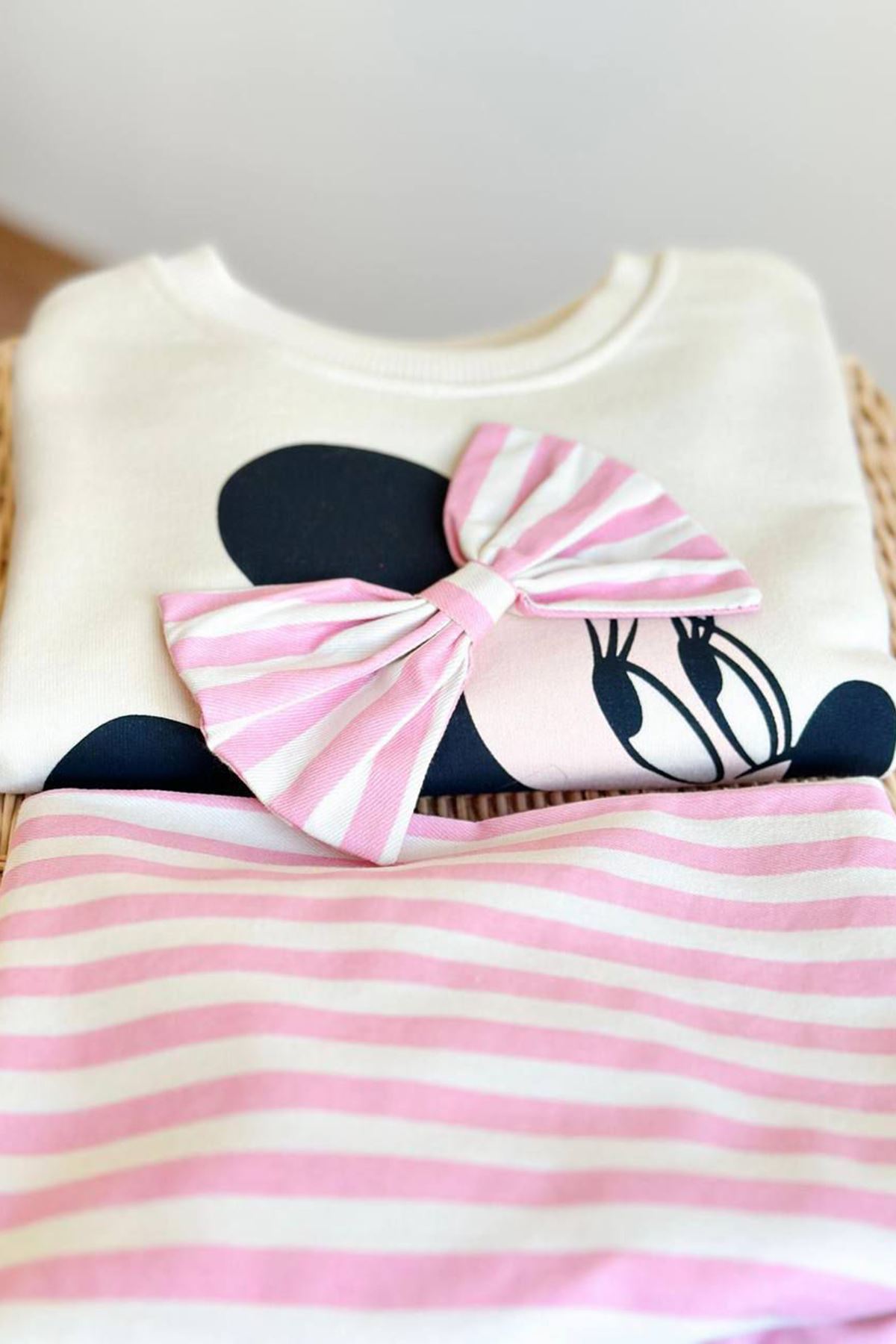 ✨ Ürün Özellikleri: 👕 Üst: Sevimli karakter baskısı ve üzerine yerleştirilmiş 3 boyutlu çizgili fiyonk detayıyla dikkat çeken yumuşak dokulu sweatshirt. 👖 Alt: Lastikli bel yapısına sahip, pembe-beyaz dikey çizgili rahat pantolon. 🧵 Hafif, esnek ve rahat kumaşı sayesinde günlük kullanım için idealdir.