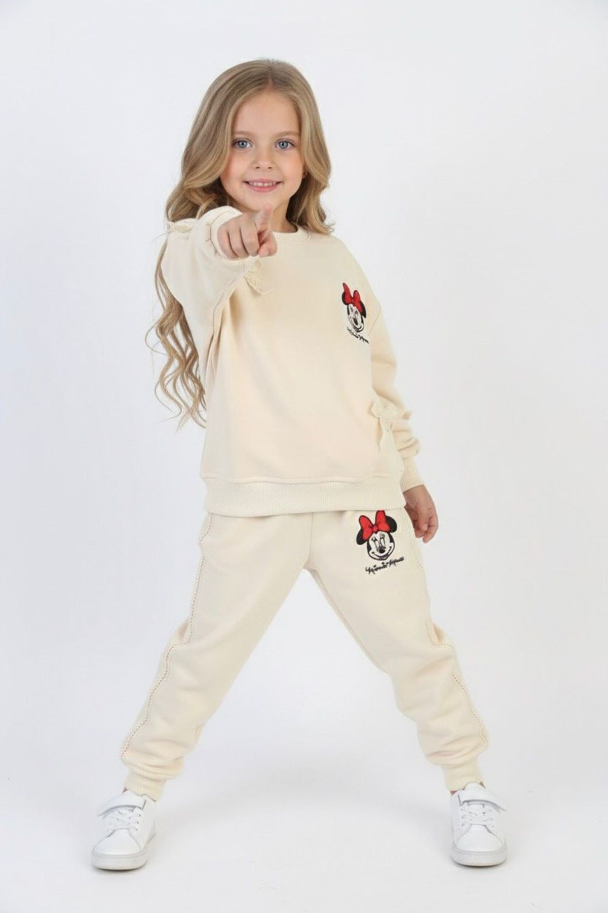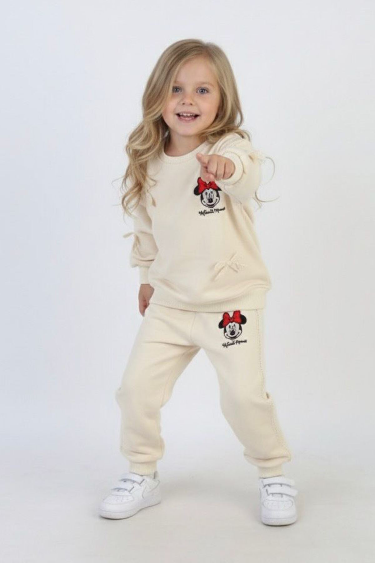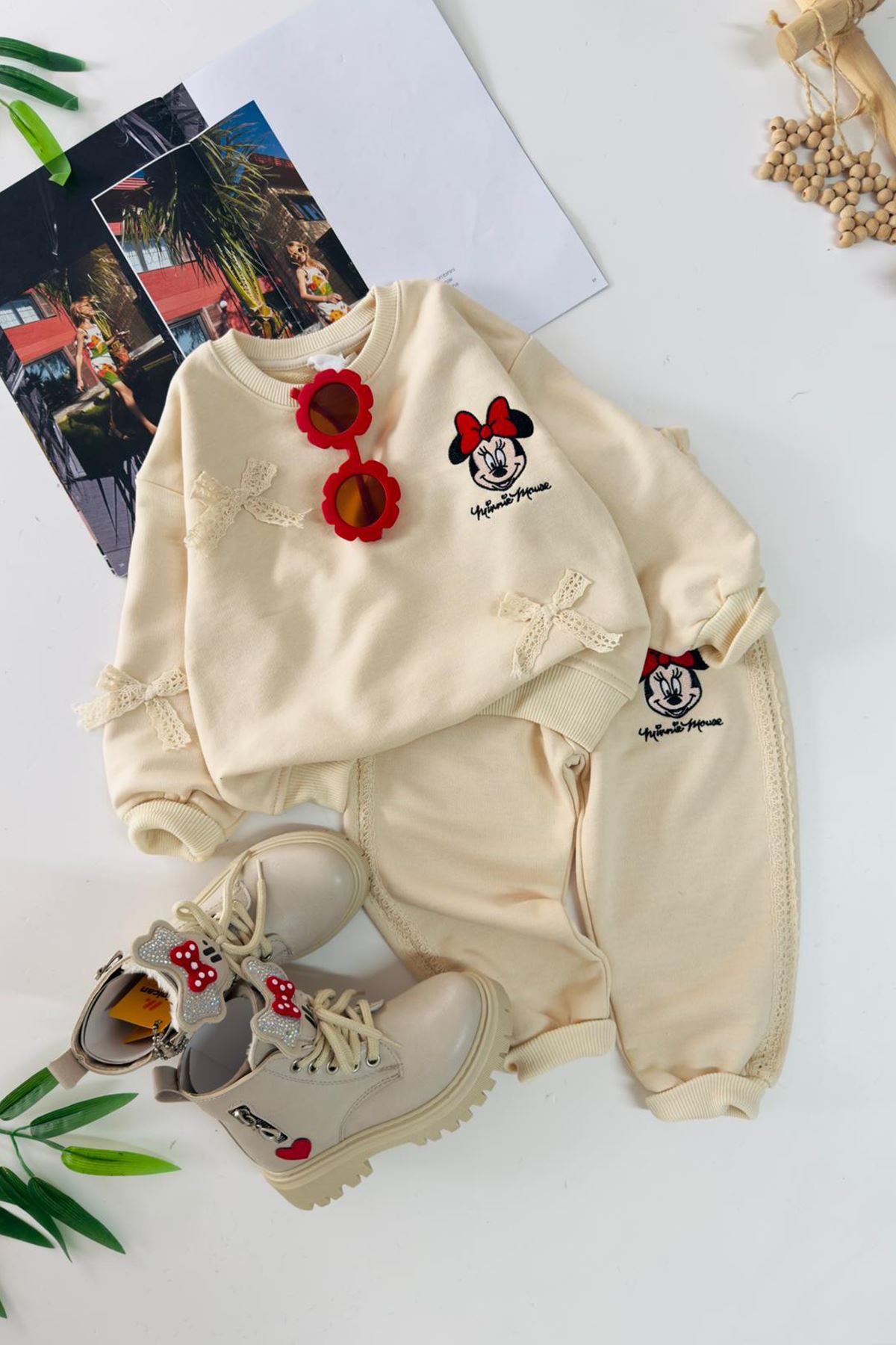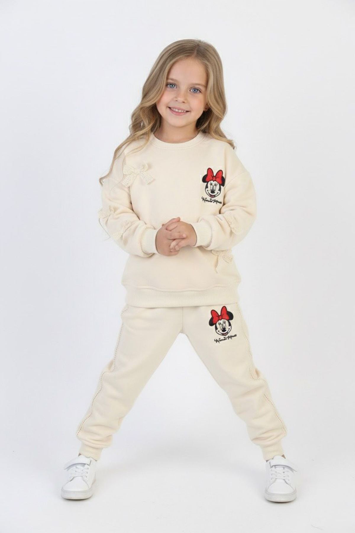 ✨ Ürün Özellikleri: 👚 Takım içeriği: Sweatshirt ve eşofman altı. 🎀 Omuzda fiyonk süslemeleri, kız çocuklarına özel zarif bir dokunuş sunar. 🐭 Karakter baskısı, çocukların ilgisini çeker ve takıma eğlenceli bir hava katar. 🧵 3 ip şardonsuz kumaş, iç kısmı tüysüzdür; mevsim geçişlerinde ideal sıcaklık sağlar. 👖 Beli ve paçaları lastikli alt parça, rahat hareket imkânı sunar ve üzerde sabit durur. 🧼 Günlük kullanım, okul, misafirlik ve dış mekân aktiviteleri için uygundur. 🎀 Parçalar ayrı ayrı da kombinlenebilir, çok yönlü kullanım sunar.