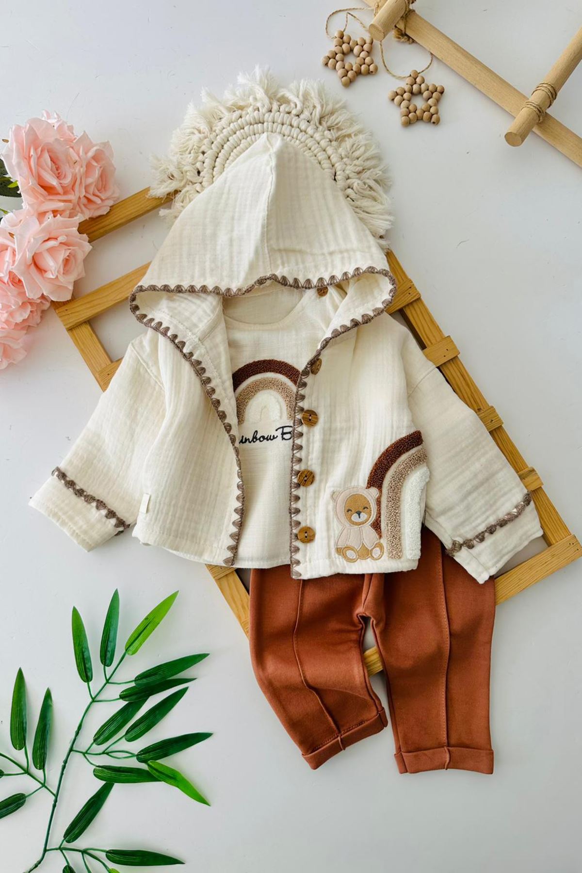 Doğal dokusu ve şirin detaylarıyla öne çıkan bu takım, minik beylerin hem konforlu hem de şık görünmesi için tasarlandı. 🌈👶