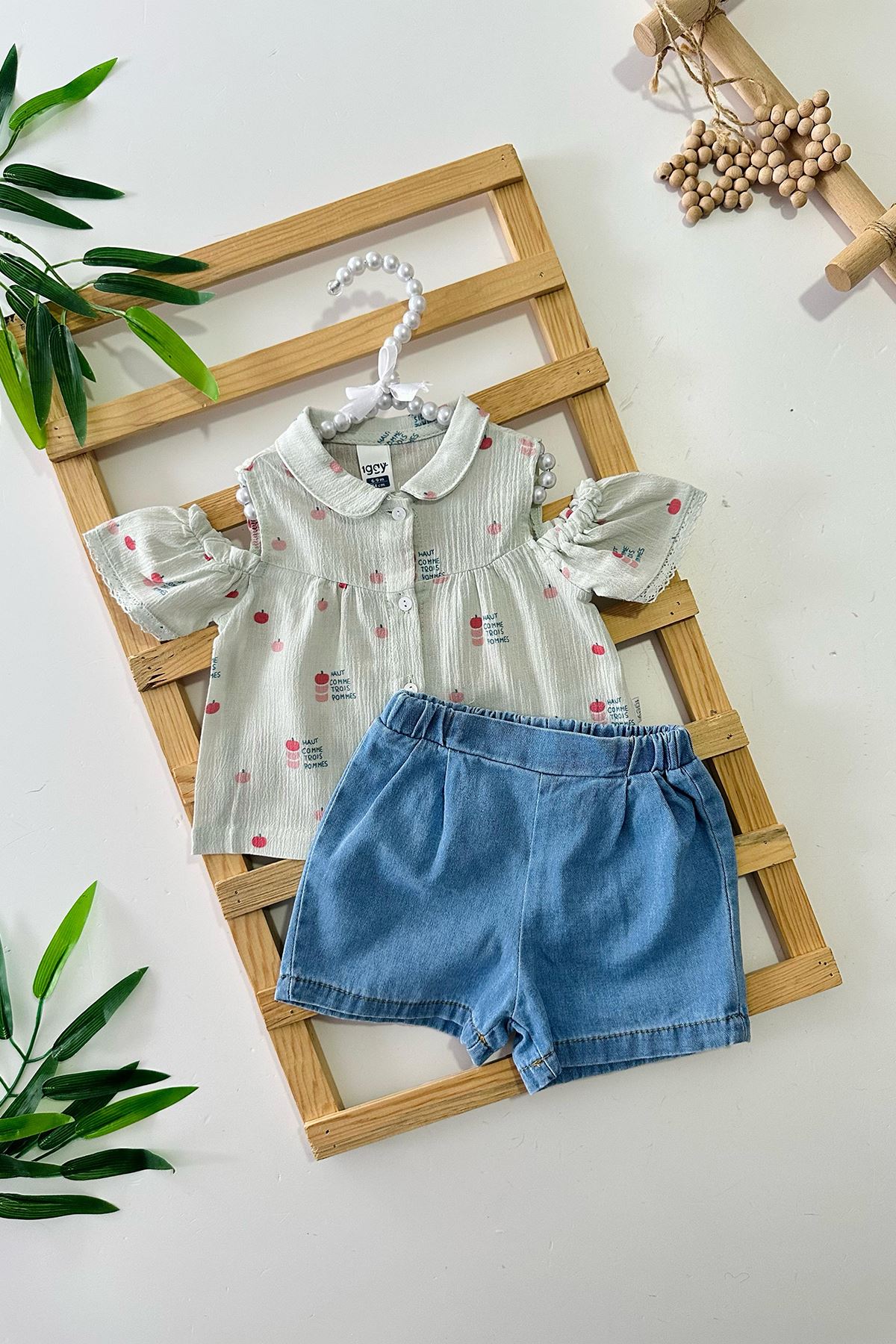 Miniğimin Cicileri Müslin Kiraz Desenli Yumuşak Kot Şortlu Kız Bebek 2 li Takım - Yeşil