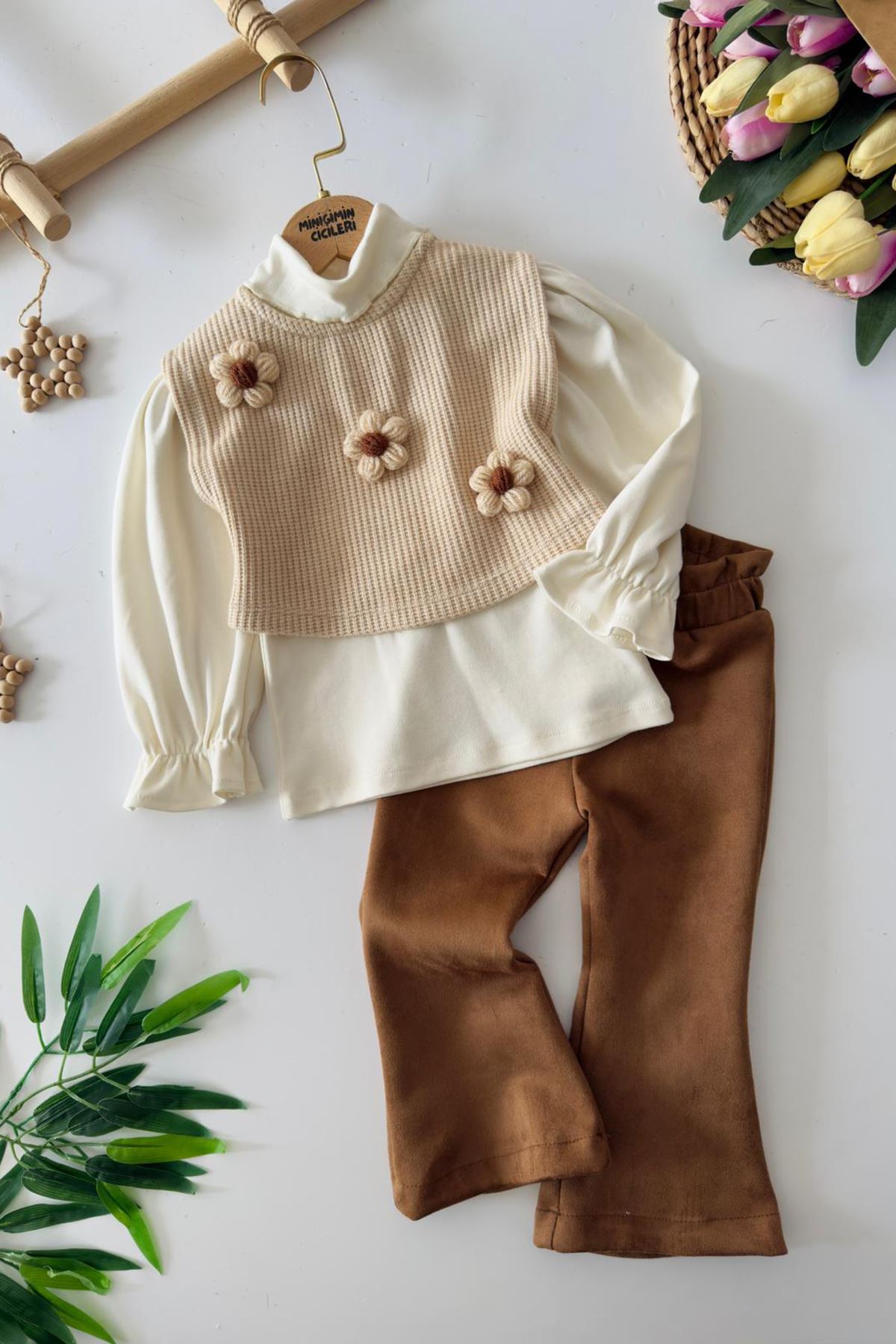 🌼 Miniğimin Cicileri Papatya Detaylı Kadife Pantolonlu Kız Çocuk 3'lü Takım