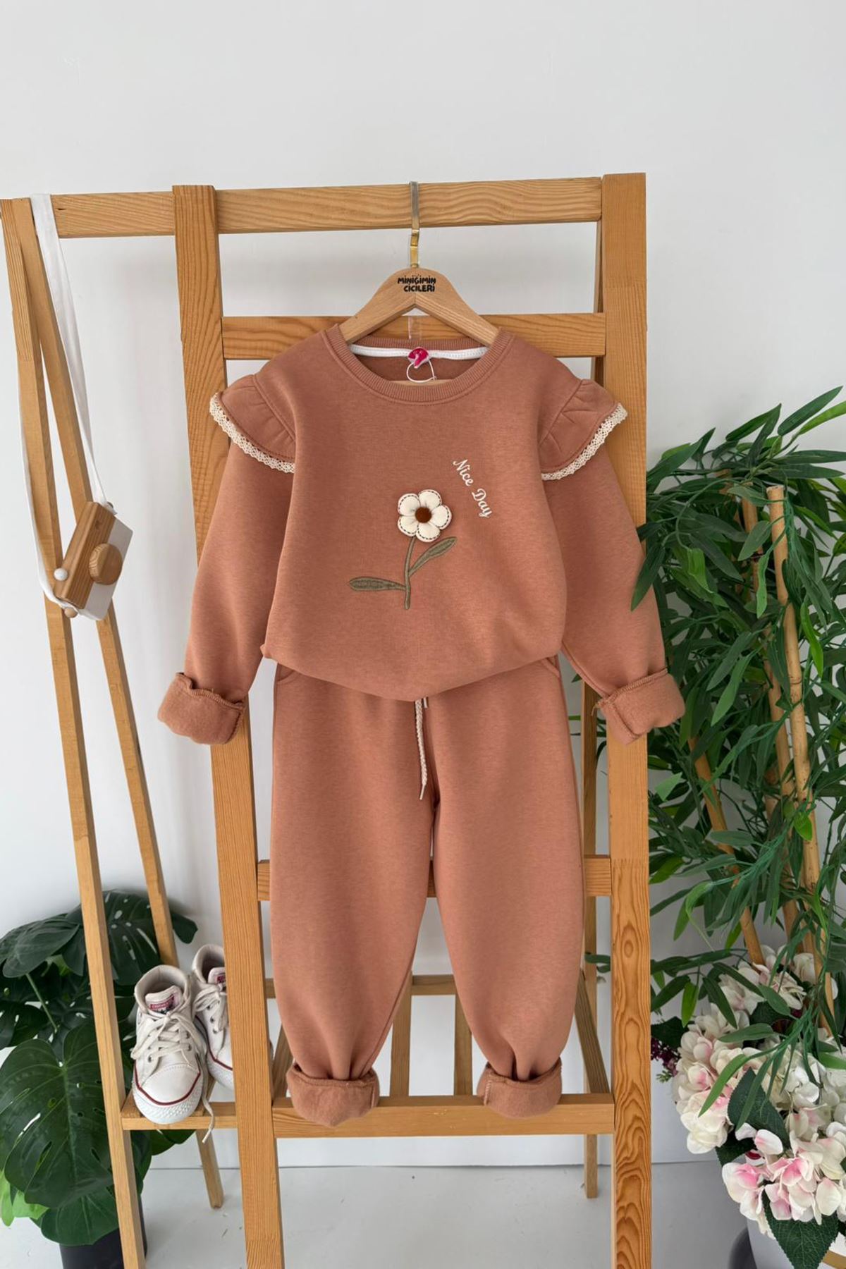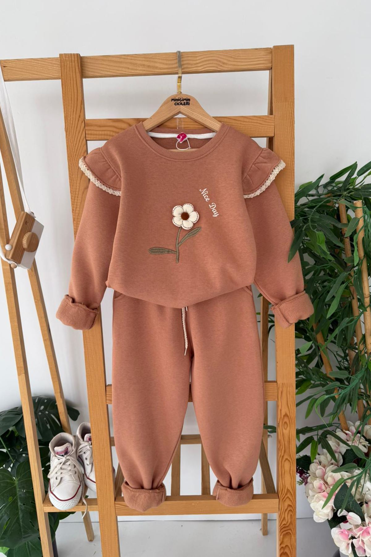Miniğimin Cicileri Papatya Detaylı Kolu Fistolu Kız Çocuk Kışlık 2 li Takım - Açık Kahve