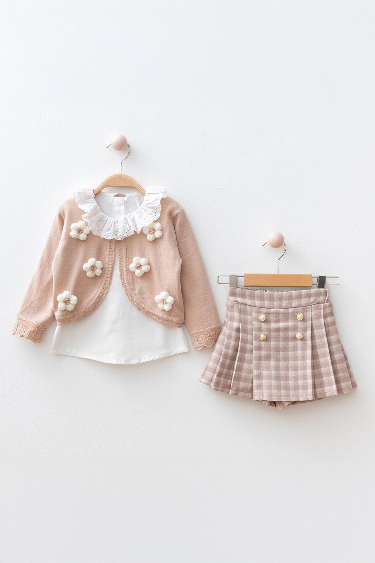 Miniğimin Cicileri Papatya Detaylı ve Ekose Şortetekli Kız Çocuk 3 lü Takım - Pembe