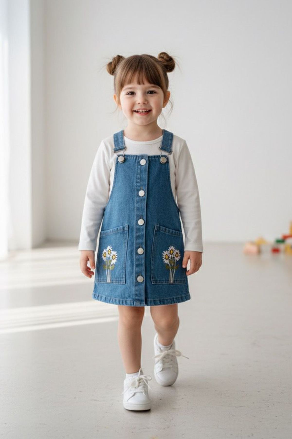Sevimli papatya işlemeleri ve kotun zamansız şıklığıyla tasarlanan bu jile, minik prenseslerin gardırobuna hem tatlı hem de modern bir dokunuş katar. 🌼👧
