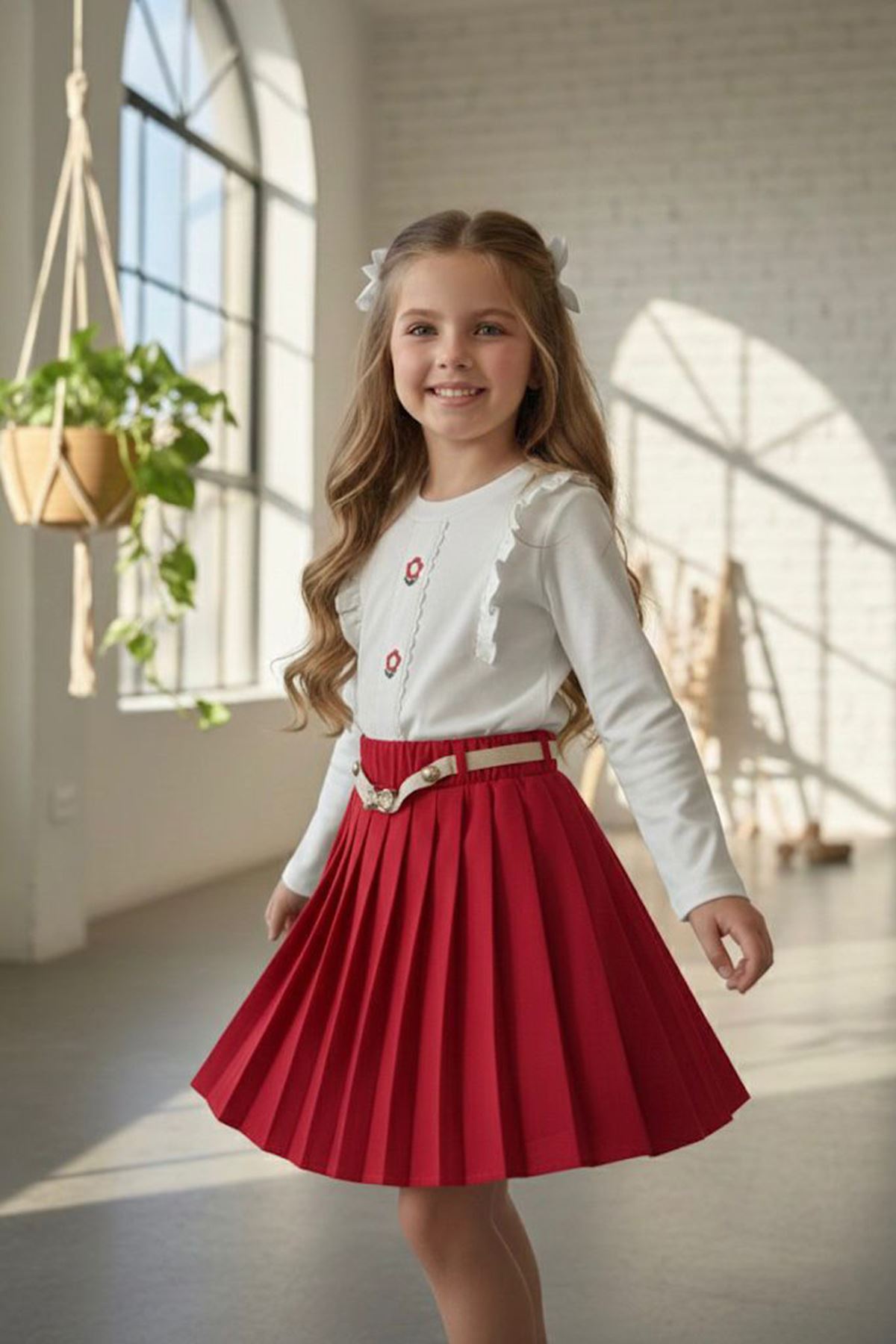 Miniğimin Cicileri Papatya İşleme Kemer Detaylı Pilise Etekli Kız Çocuk Takımn - Kırmızı