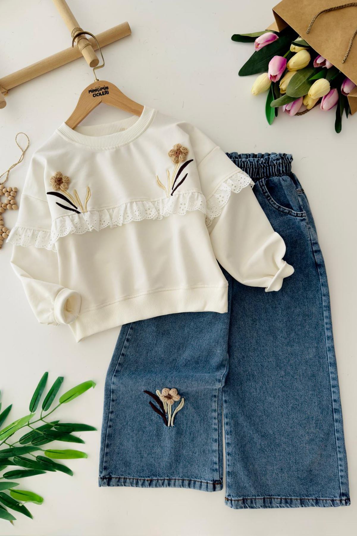✨ Ürün Özellikleri: 👕 Üst: Ön kısmında örgü papatya ve yaprak işlemeleriyle süslenmiş, fisto dantel detaylı sweatshirt. 👖 Alt: Bol paça denim pantolon, paçasında papatya temalı nakış uygulaması. 👧 Pantolon lastikli bel yapısıyla rahat ve esnek kullanım sağlar. 🧵 Hem günlük kombinlerde hem de özel günlerde tercih edilebilir, nefes alabilen kumaş yapısına sahiptir.