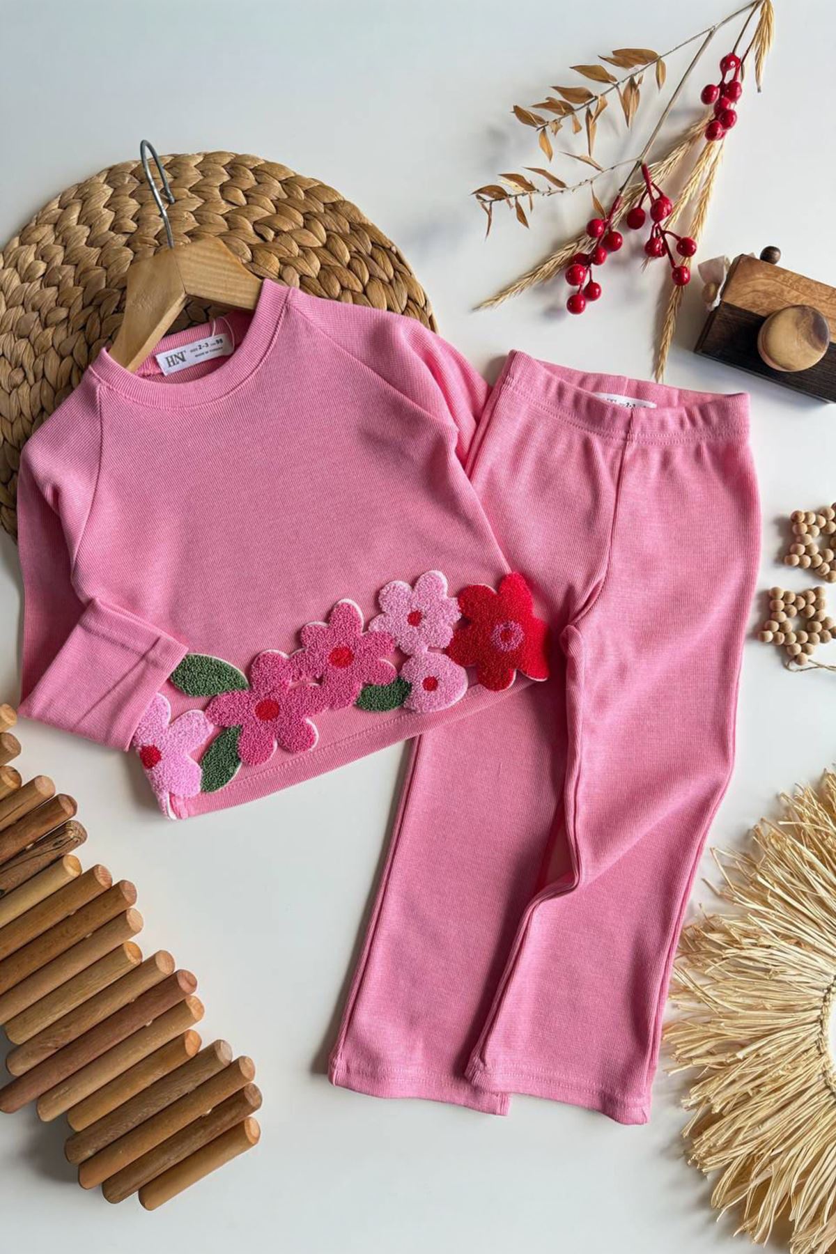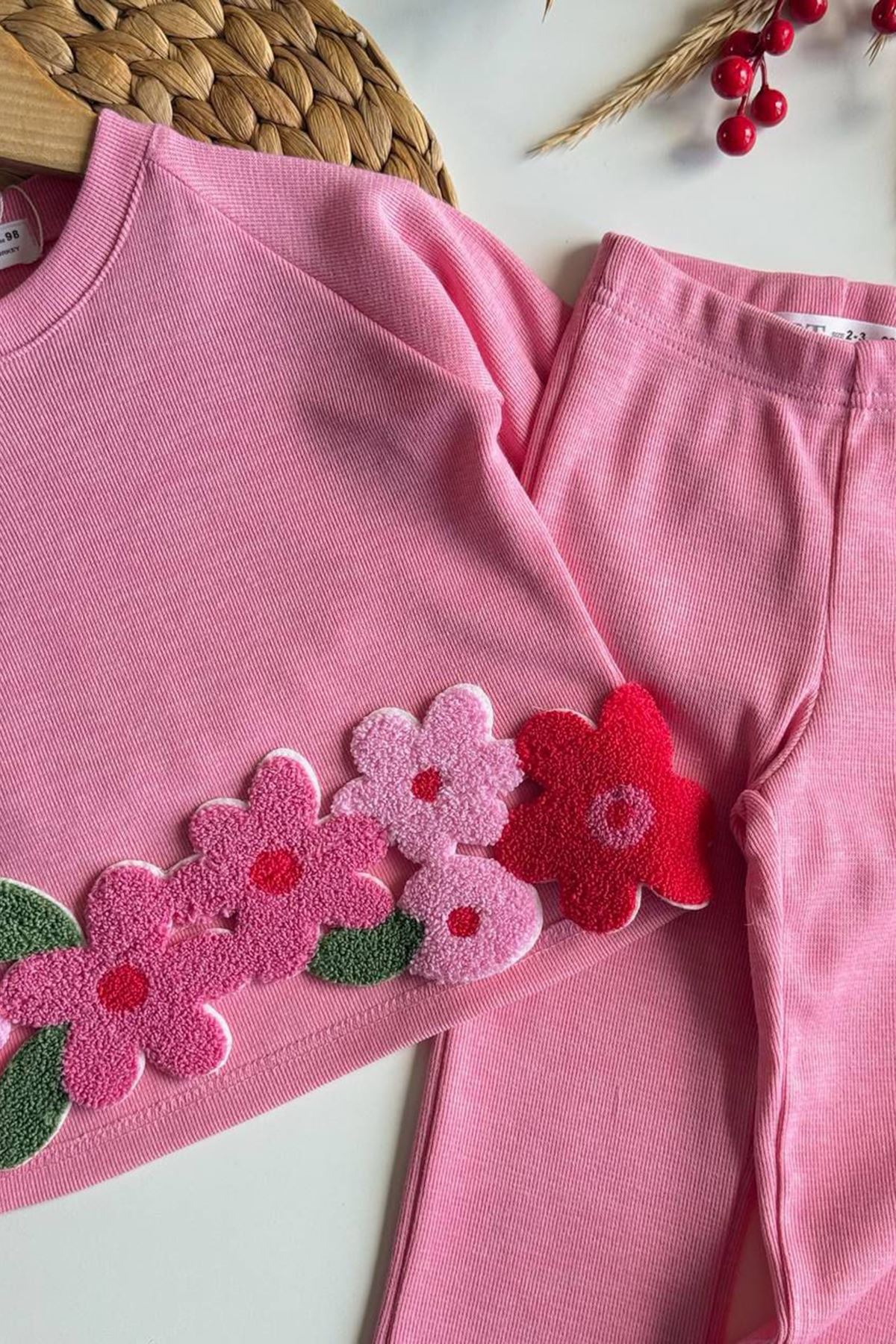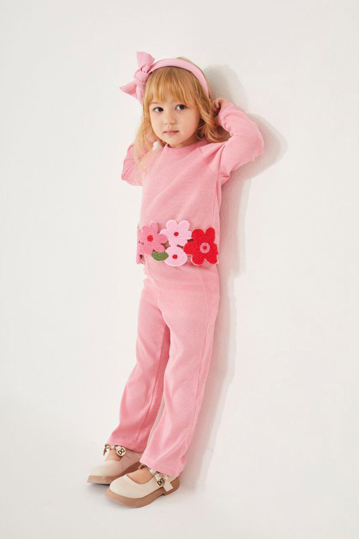 Yumuşacık örme dokusu ve zarif çiçek işlemeleriyle minik prenseslerin enerjisini yansıtan sevimli bir takım! 🌼✨