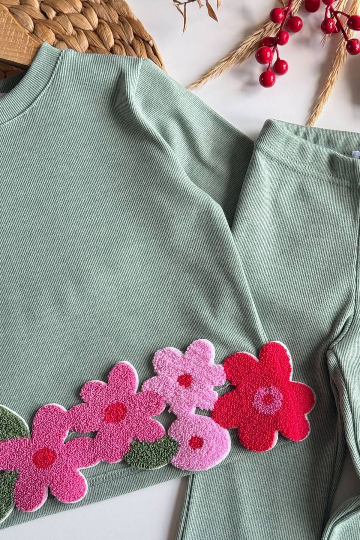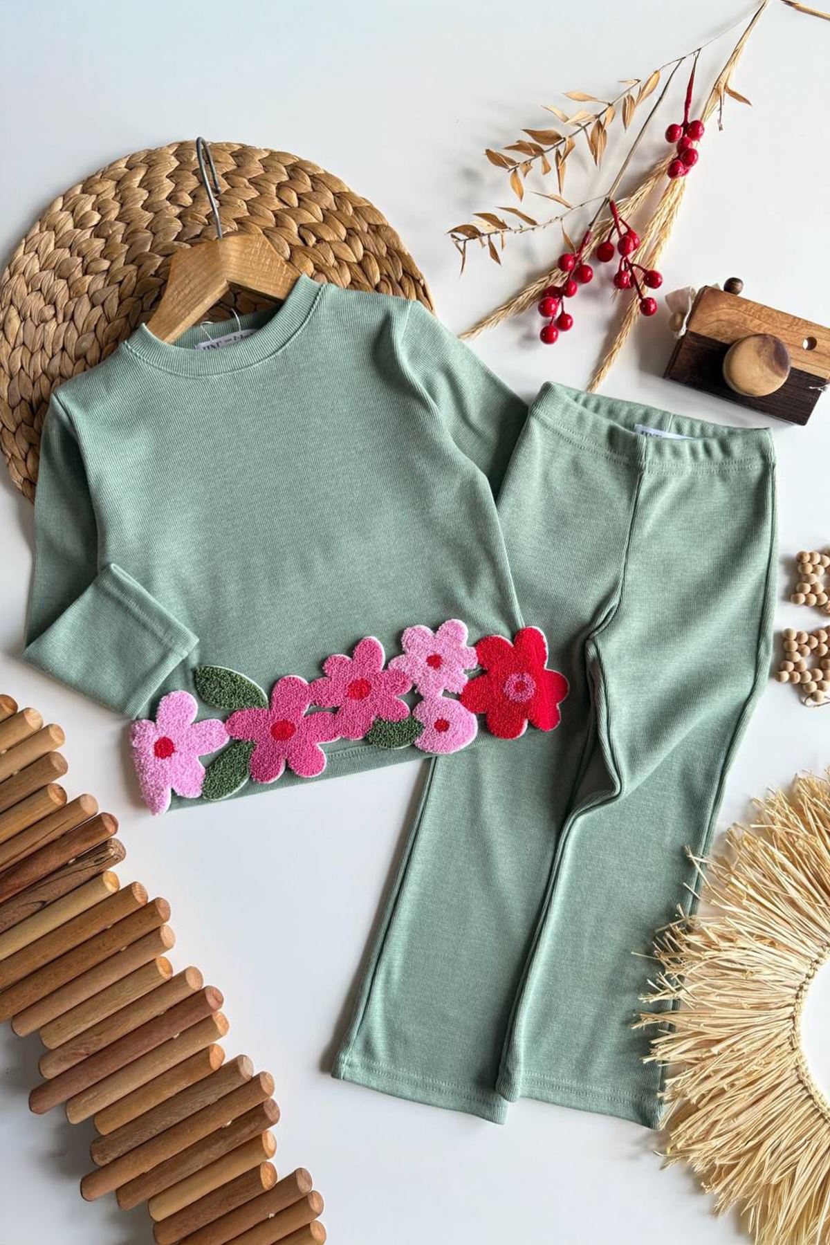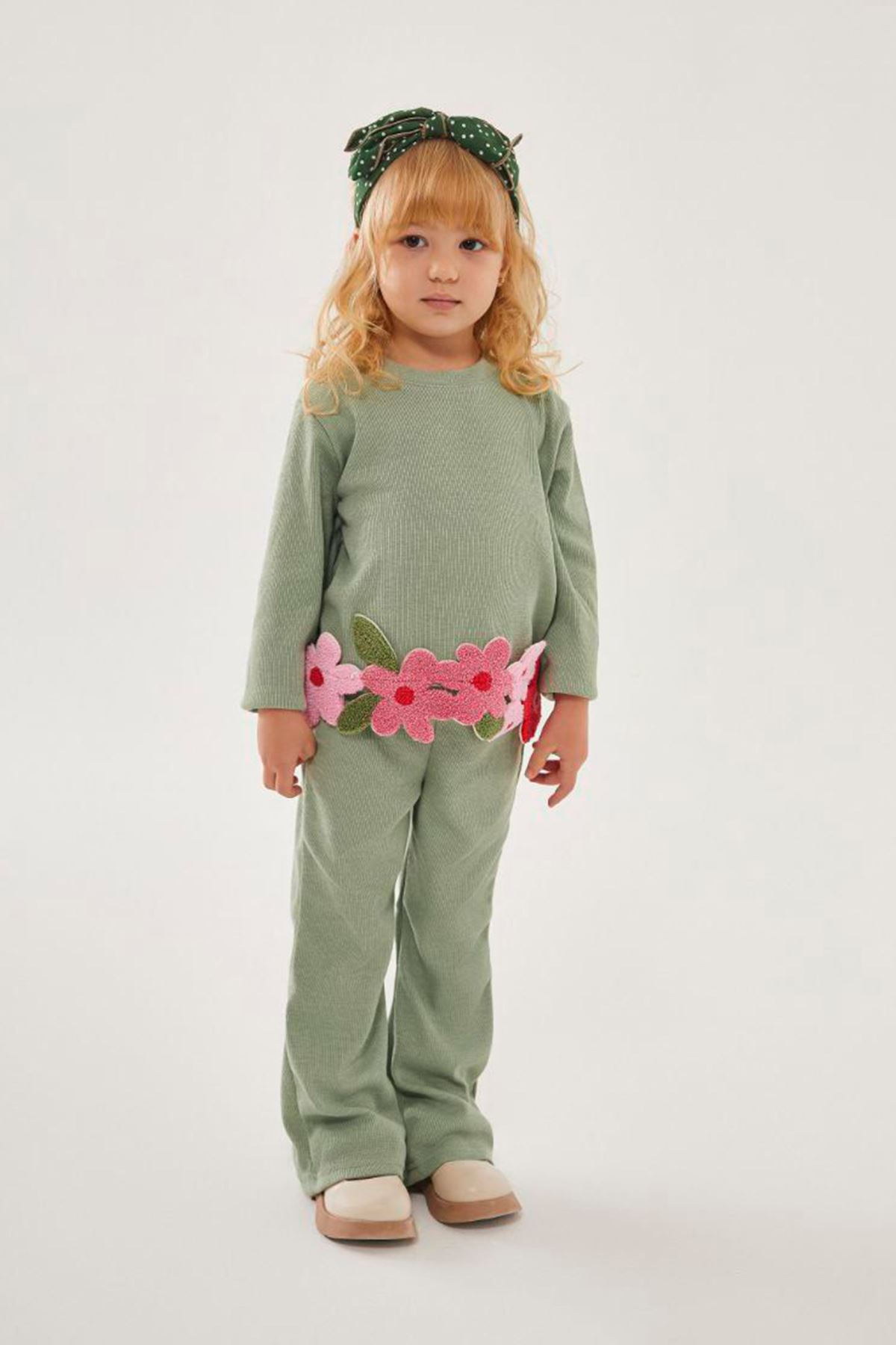 Miniğimin Cicileri Papatya Panç İşleme Detaylı Kız Çocuk 2 li Takım - Yeşil
