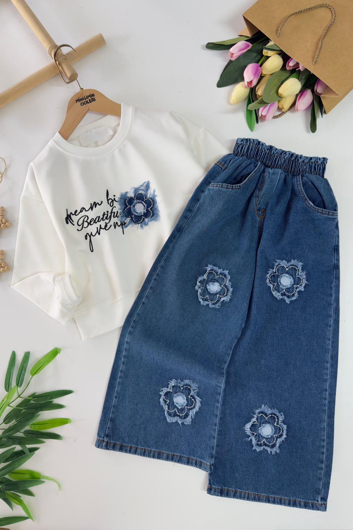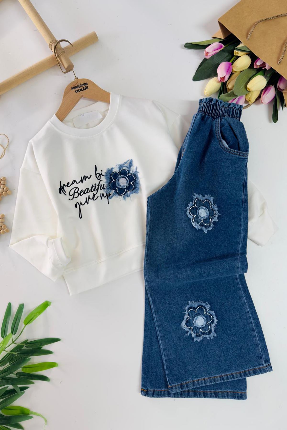 ✨ Ürün Özellikleri: 👕 Üst: "Dream Big, Beautiful, Never Give Up" yazı baskılı ve papatya yama detaylı sweatshirt. 👖 Alt: Bol paça denim pantolon, cepli tasarım ve özenle işlenmiş çiçek yamalarla süslenmiş. 🧵 Pantolonun lastikli beli, konforlu kullanım sağlarken hareket özgürlüğü sunar. 🌟 Hem spor hem şık görünümüyle okuldan gezilere, günlük kullanıma kadar her ortam için uygun.