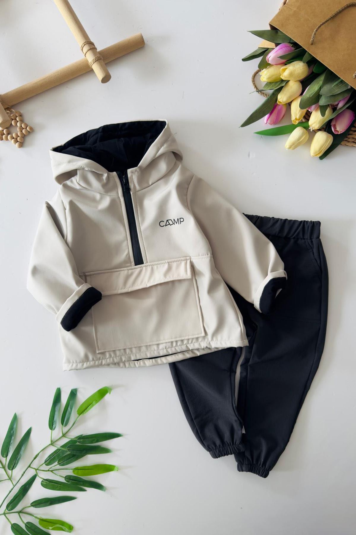 🧵 Ürün Özellikleri: 💫 Üst parça su itici paraşüt kumaştan üretilmiştir. 🧥 Kapüşonlu tasarımı sayesinde rüzgarlı havalarda ekstra koruma sağlar. 👖 Alt parça esnek ve rahat yapısıyla gün boyu konfor sunar. 🎒 Kanguru cep detayıyla spor bir görünüm kazandırır. 🌿 Rahat kalıbı sayesinde günlük kullanımda hareket özgürlüğü sağlar.
