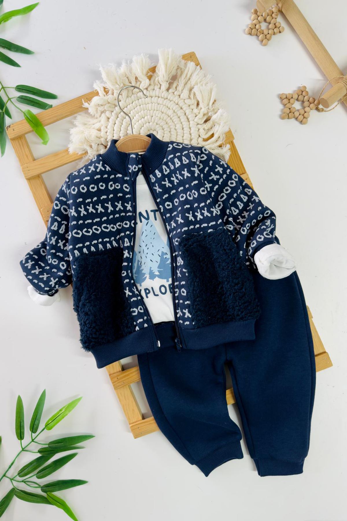 🔖 Miniğimin Cicileri Polar Cep Detaylı Desenli Erkek Çocuk 3’lü Kışlık Takım