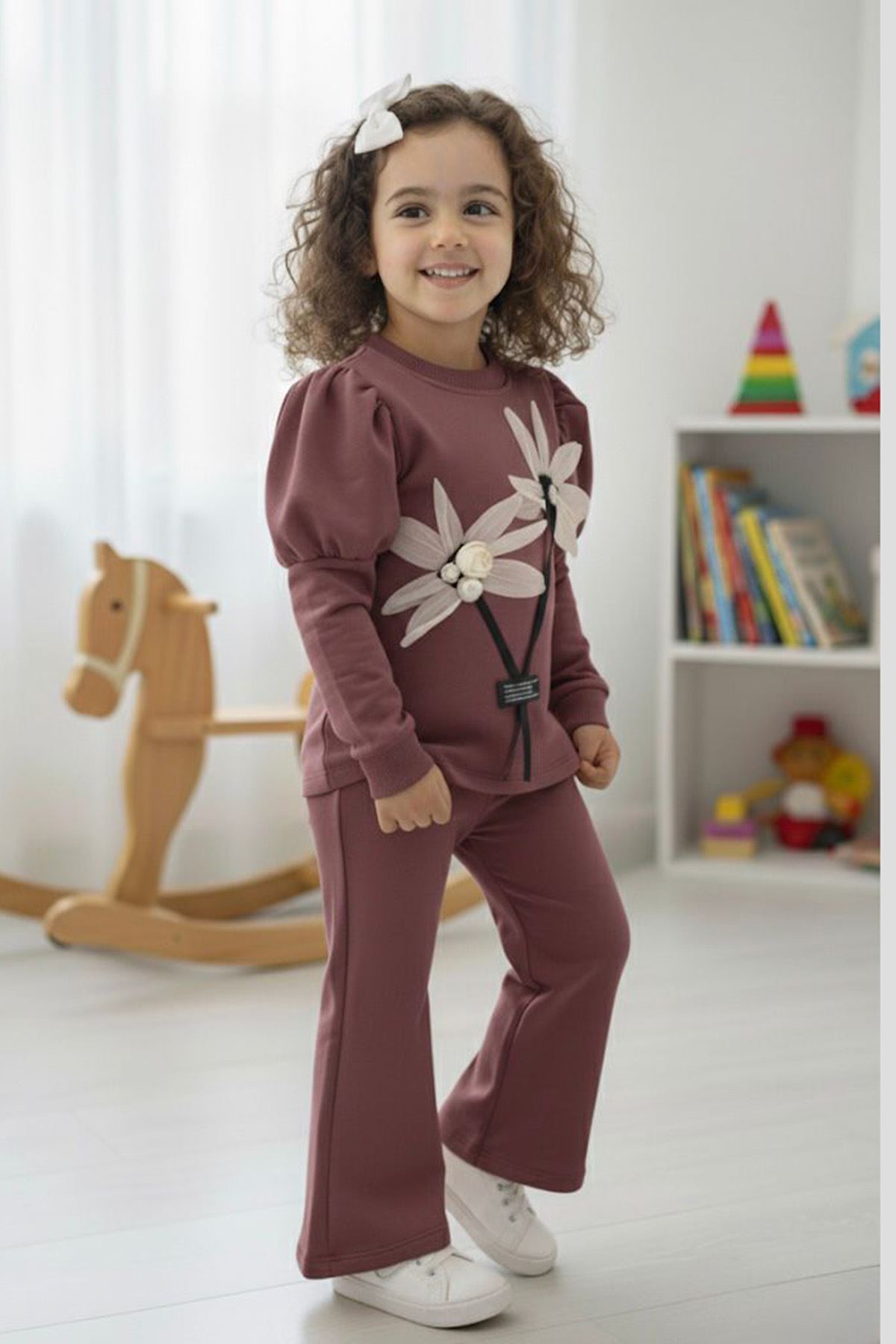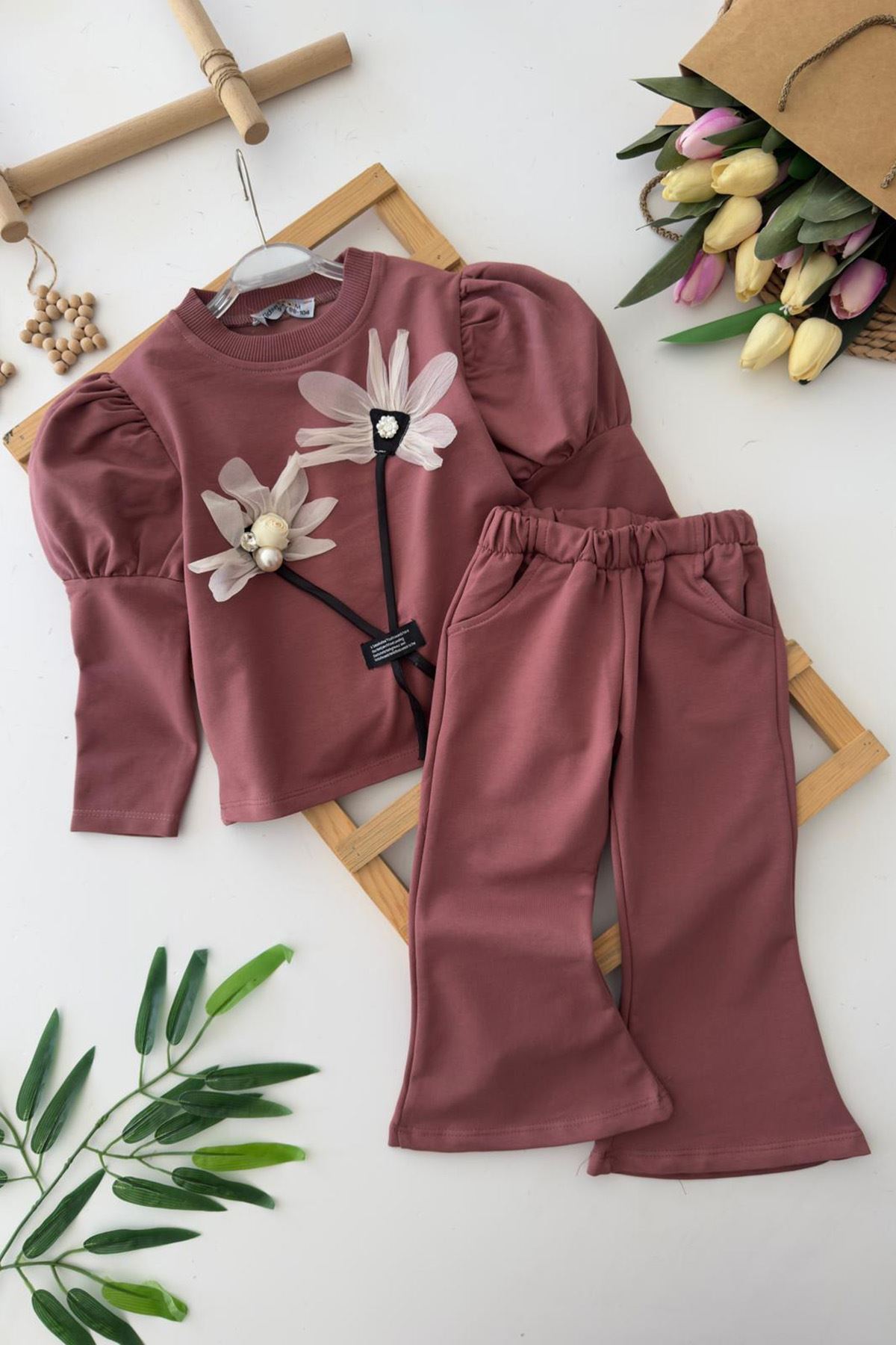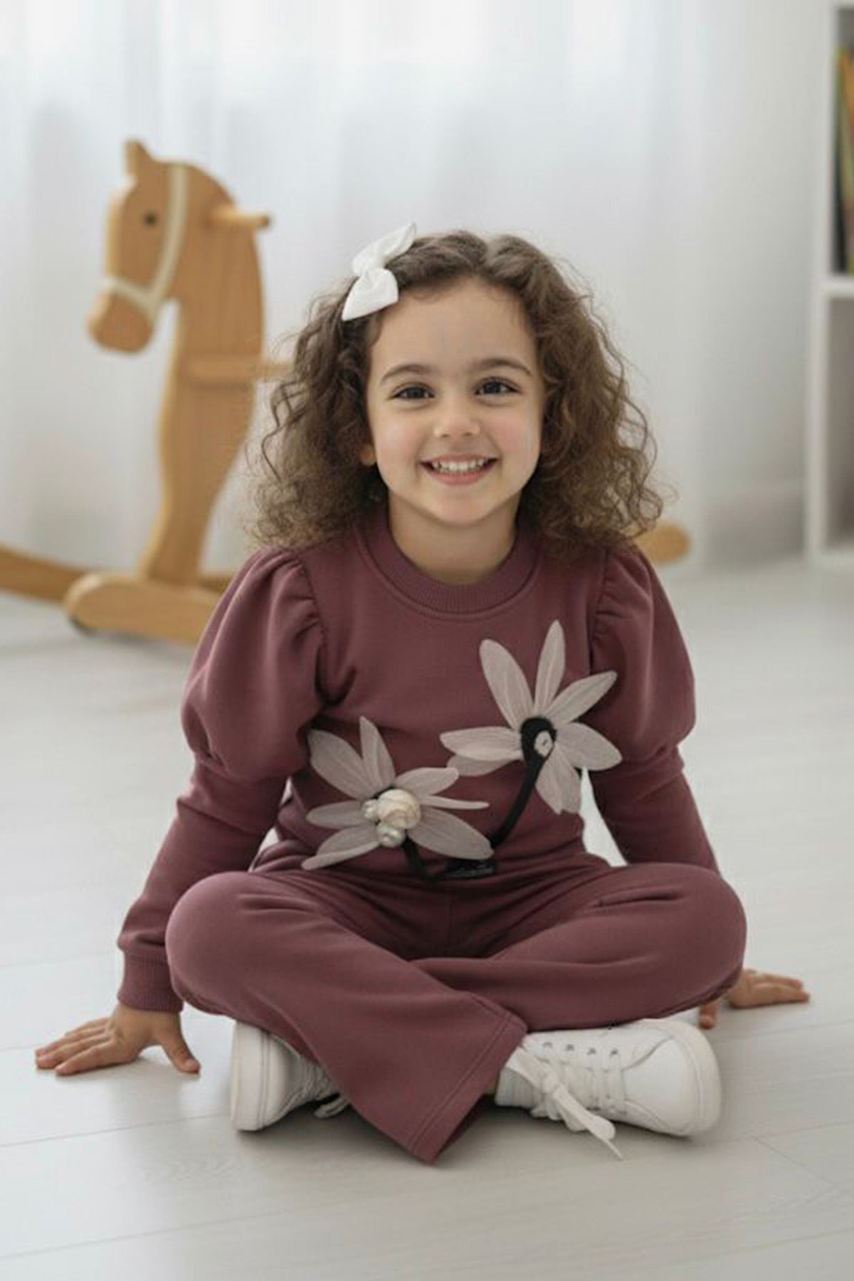 👗 Ürün Özellikleri: 💛 2 ip şardonsuz kumaştan üretilmiştir; yumuşak dokusu sayesinde rahat bir kullanım sunar. 🌼 Üst kısmında yer alan üç boyutlu çiçek ve inci detayları, tasarıma zarafet katar. 🎀 Prenses kol kesimiyle modern ve sevimli bir duruş sağlar. 👖 Esnek bel yapısına sahip pantolon, gün boyu konfor ve hareket özgürlüğü sunar. 🌿 Günlük kullanımda veya özel günlerde tercih edilebilecek şık bir seçenektir.