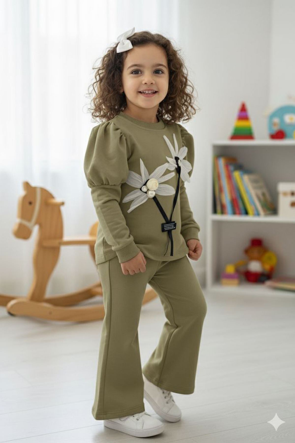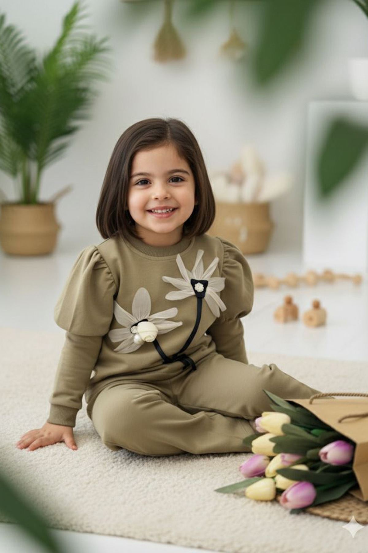 Zarif çiçek detayları ve prenses kol tasarımıyla minik hanımların gardırobuna şıklık katacak harika bir kombin! 🌸✨
