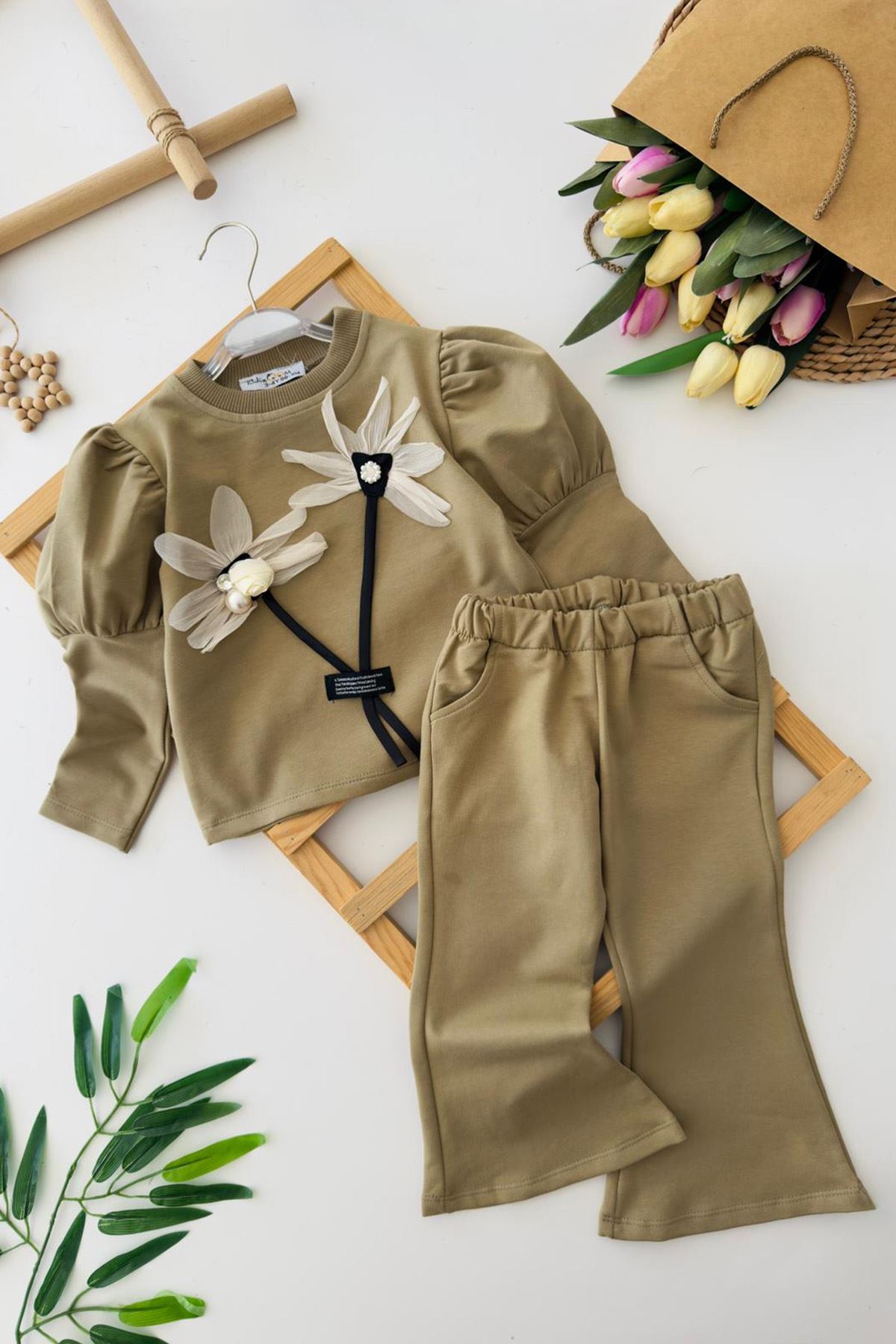 Miniğimin Cicileri Prenses Kol Detaylı Çiçekli Kız Çocuk 2 li Takım - Haki